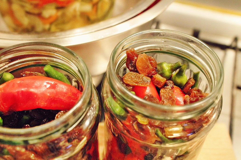 Oțetul se fierbe ca. 5 minute, împreună cu zahărul și sarea, apoi se toarnă fierbinte peste ardeii și stafidele aranjate frumos în borcan.