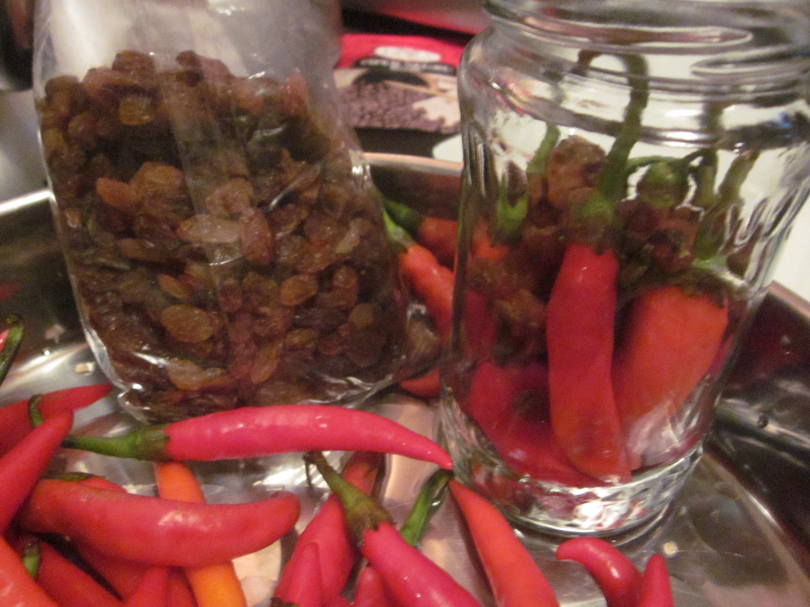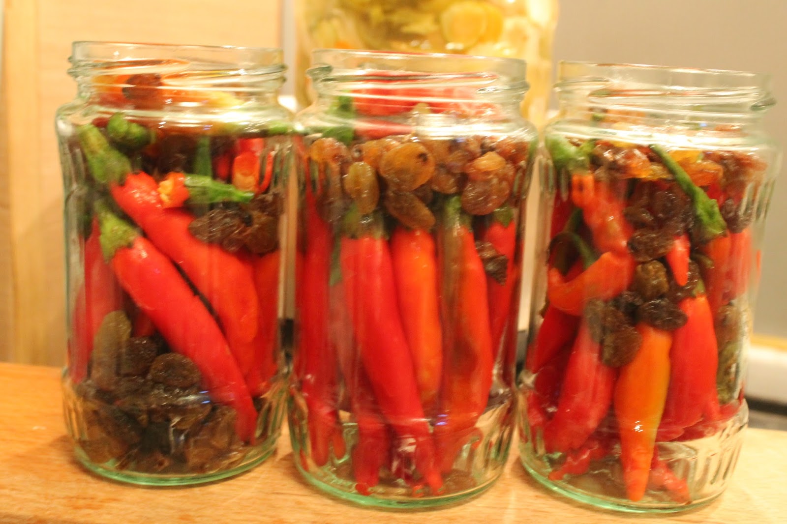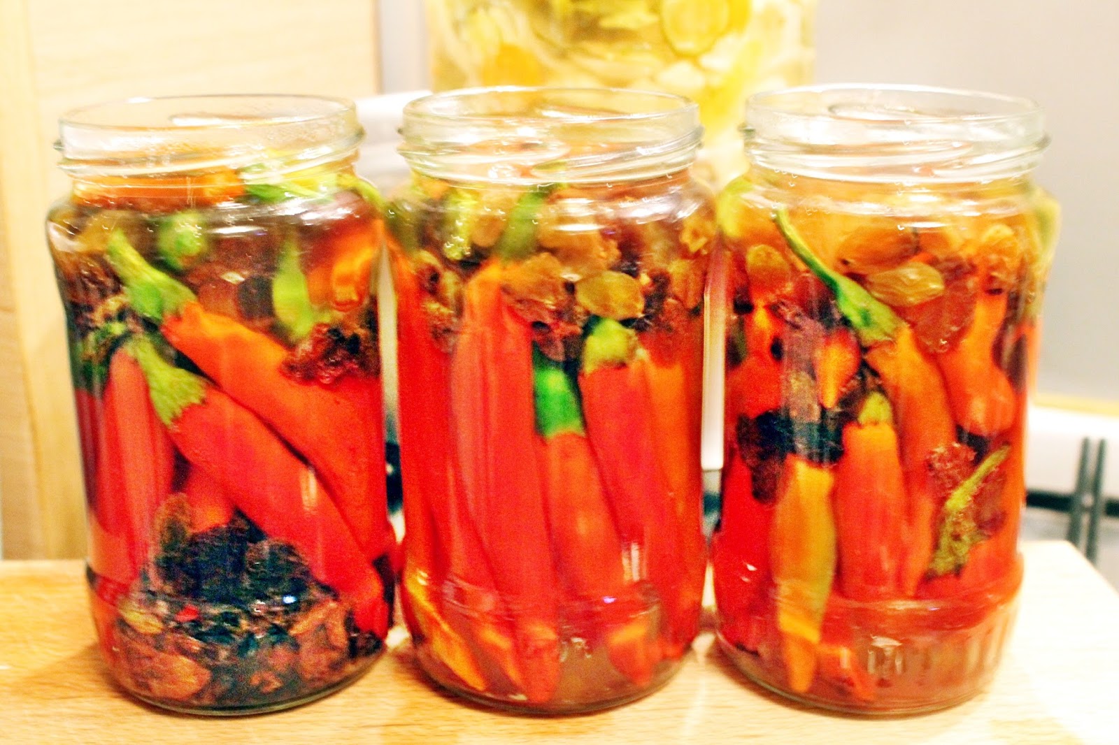 Ardeii se spală, se taie codițele dacă sunt mai lungi. Se sterilizează 3 borcane de 400 g, în care se așează estetic ardeii în borcane, printre ei strecurându-se stafidele.