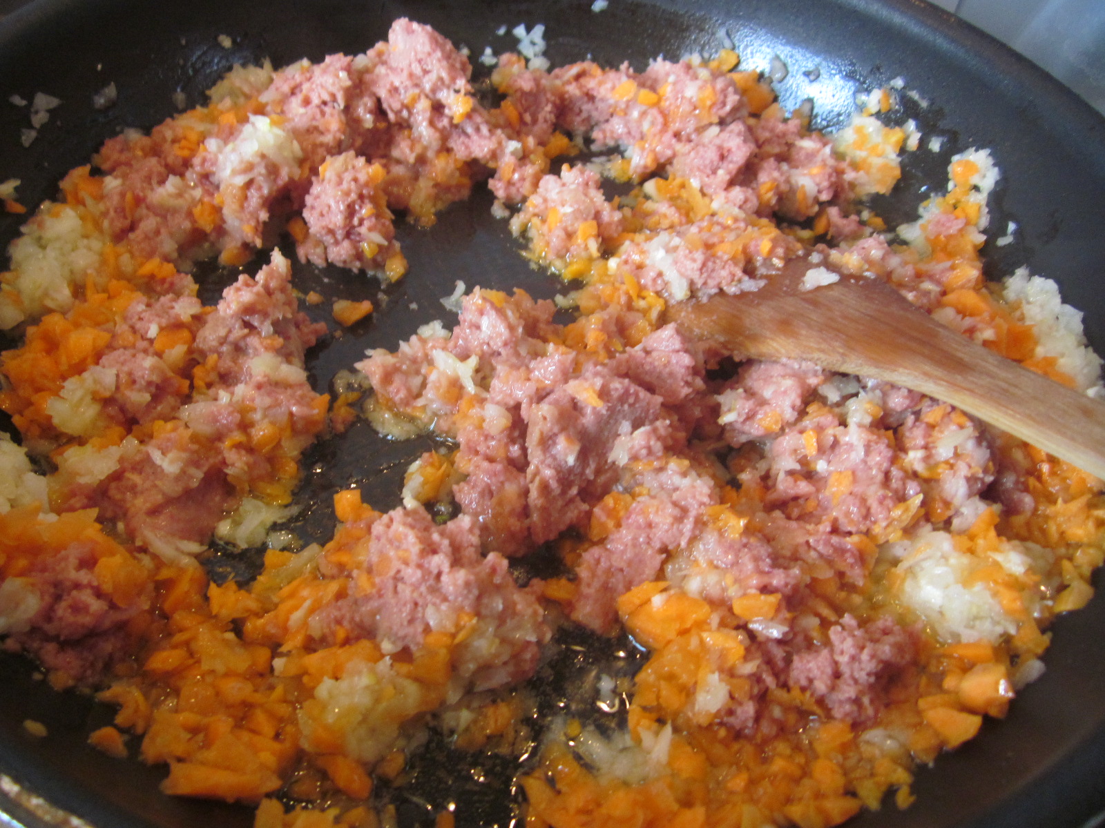 - Legumele (ceapa, usturoiul, ardeiul copt, morcovul) se curăță se toacă mărunt și se dau la dinstiut în puțin ulei și apă. Se adaugă carnea din conservă mărunțită, roșiile cubulețe, porumbul din conserva SunFood, se asezonează de mirodenii, iar la final se oprește focul și se adaugă ouăle de prepeliță bătute, se amestecă energic ca să se încorporeze toate ingredientele.