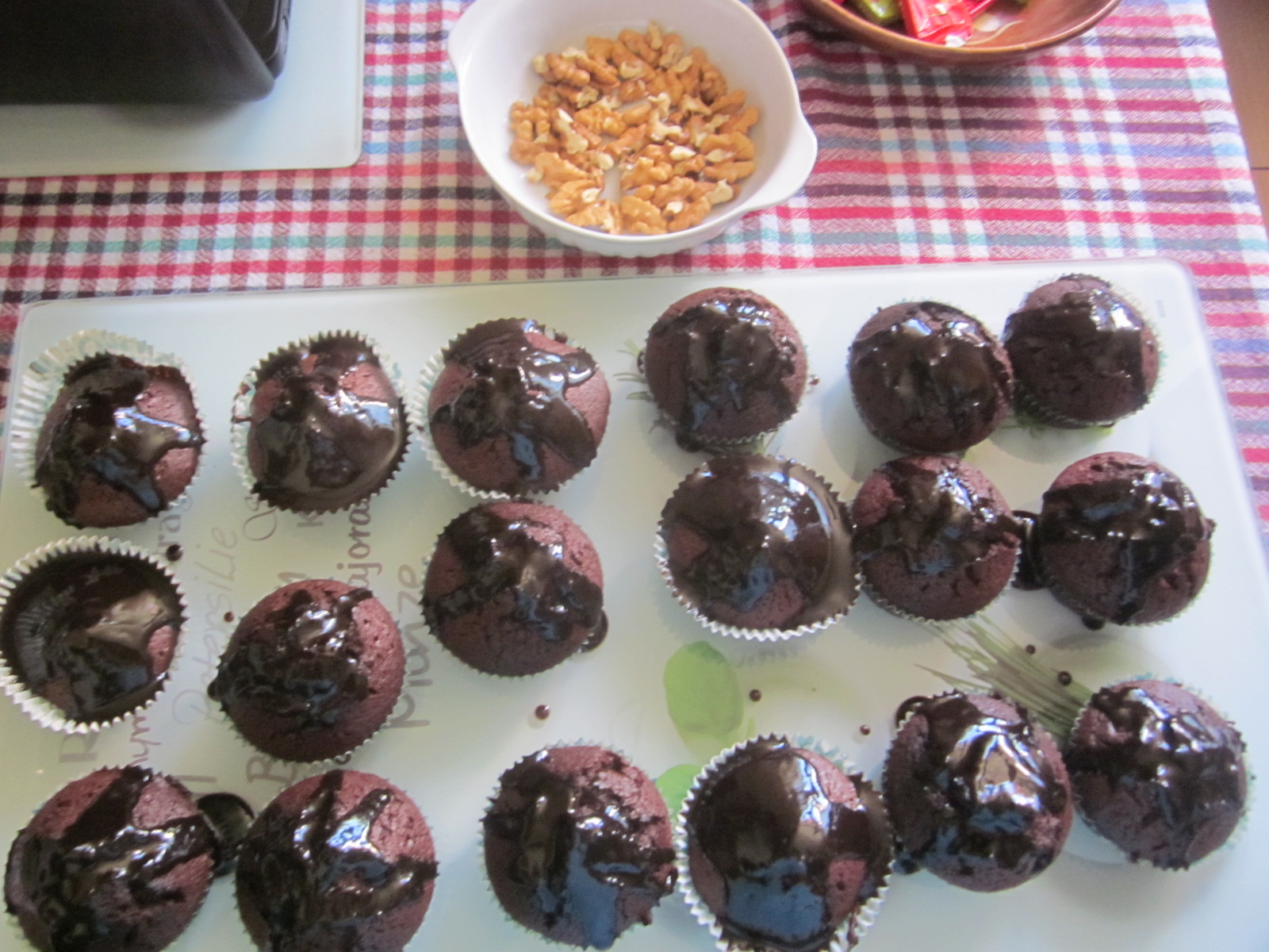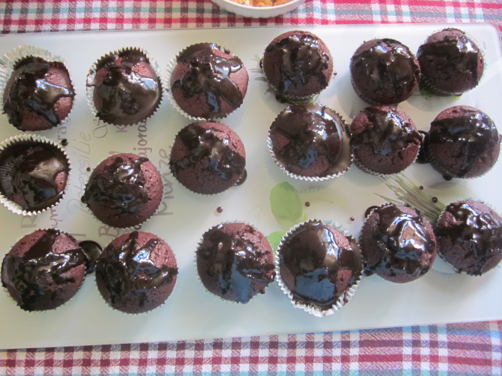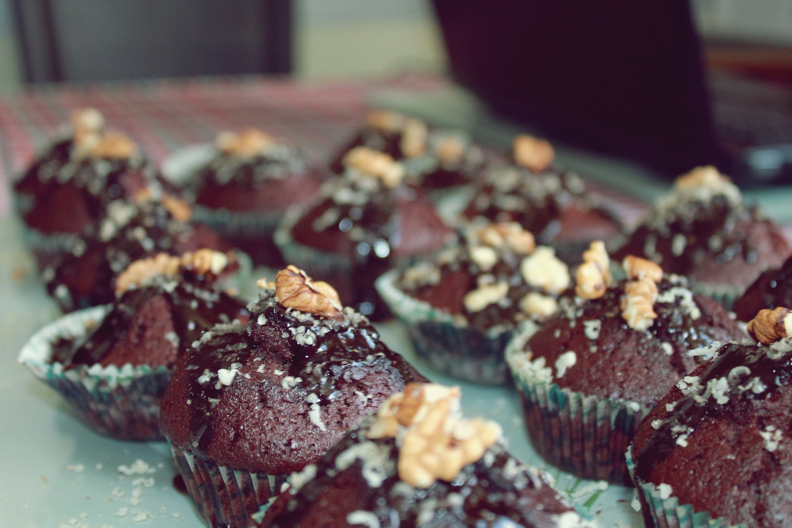 Între timp se topește ciocolata pe baie de aburi, cu 2-3 linguri de smântână lichidă. După ce au trecut testul scobitorii se scot din cuptor și se ornează cu glazură de ciocolată, fulgi și miez de nucă. spor și poftă bună! 😉