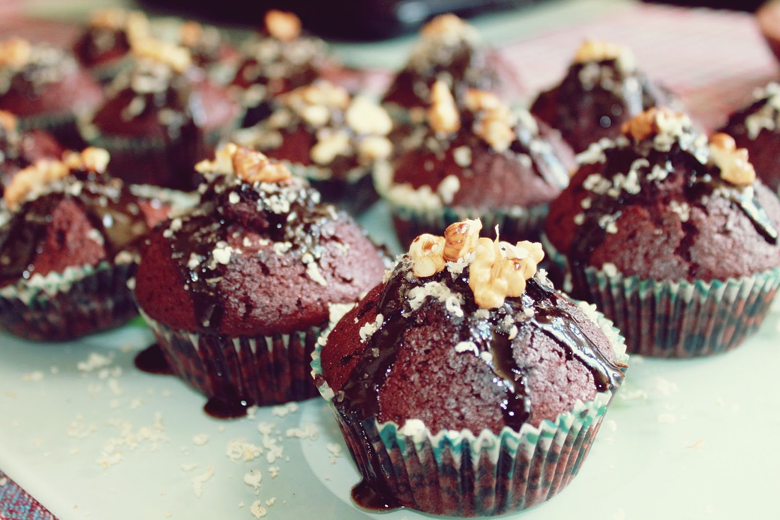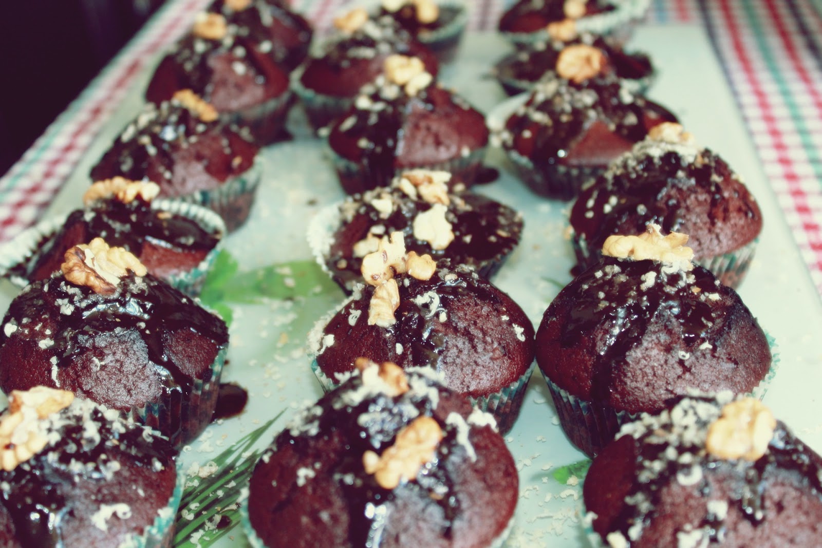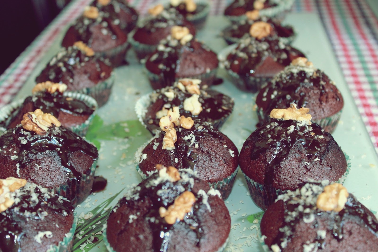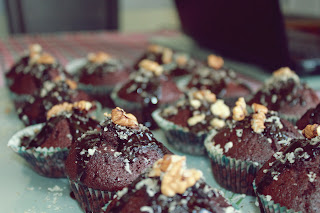 Între timp se topește ciocolata pe baie de aburi, cu 2-3 linguri de smântână lichidă. După ce au trecut testul scobitorii se scot din cuptor și se ornează cu glazură de ciocolată, fulgi și miez de nucă. spor și poftă bună! 😉