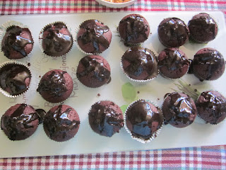 În tava de brioșe, tapetată cu forme de hârtie se adaugă cca. 2 linguri din compoziția rezultată, apoi se ăun tăvile la copt cca. 20 de minute la 200 grade, în cuptorul preîncălzit.