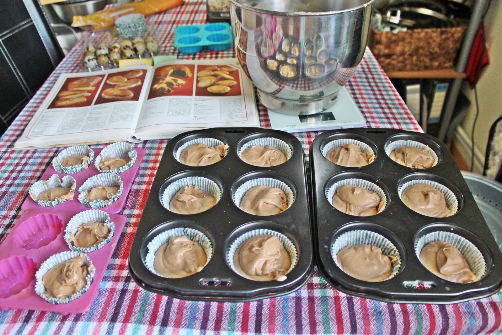 După ce s-a răcit un pic se adaugă la compoziția de ouă. La final se adaugă făina cernută împreună cu praful de copt și se amestecă ușor, până ce se înglobează în compoziție. Aluatul obținut se toarnă în formele de brioșe și se pun la copt în cuptorul preîncins cca. 30 de minute la 175 grade.