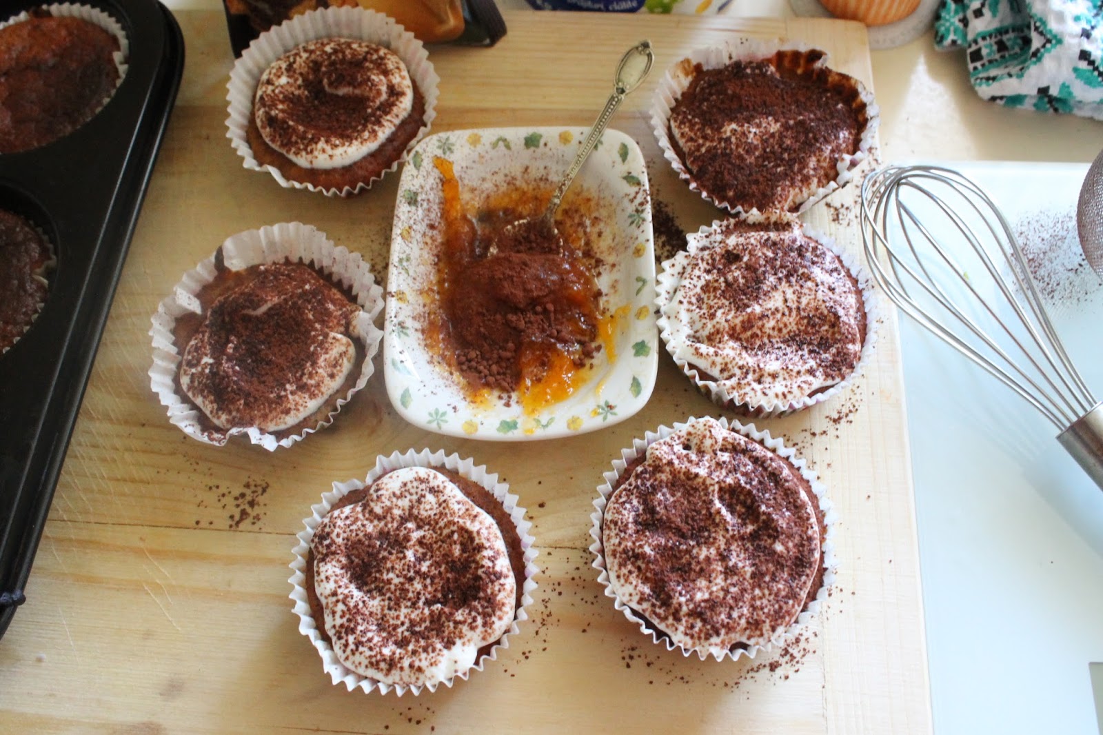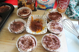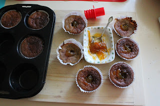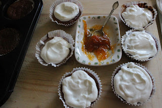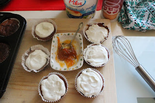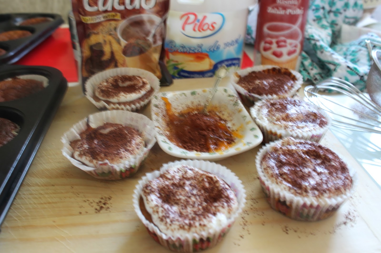 - După ce s-au răcit brioșele, se scobesc cu un aparat special, sau cu nare grijă cu o linguriță, în locașul rămas se pune o linguriță sau două de dulceață din dovleac, rețeta aici: , apoi se acoperă cu cremă din brânză și se presară pudră de cacao 😉