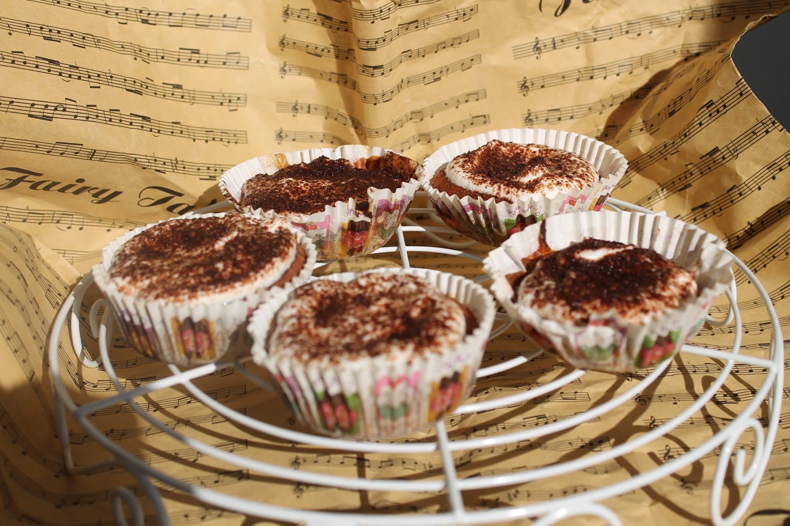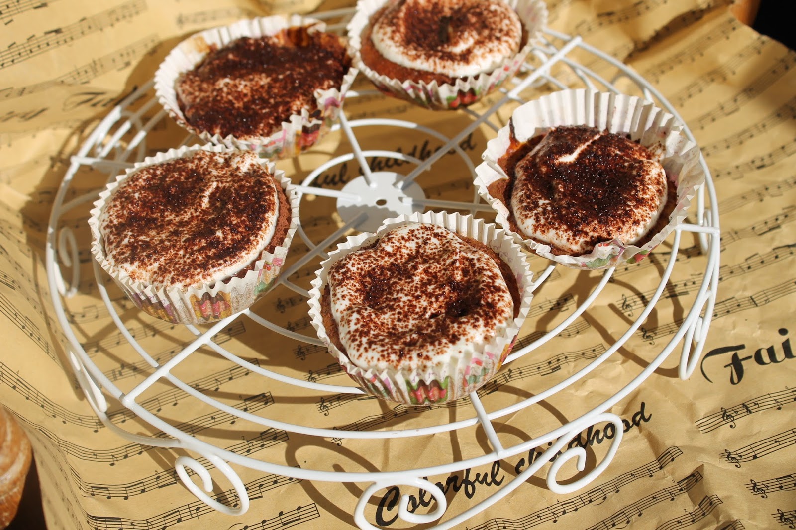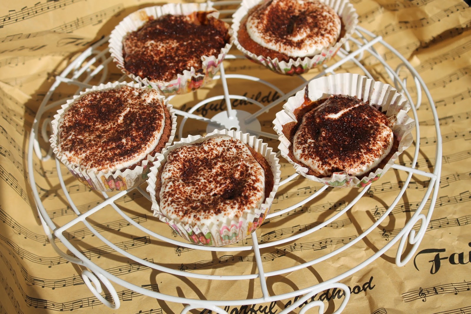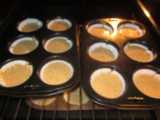 - Aluatul rezultat se toarnă în form de brioșe, tapetate cu unt și făină, sau mai ușor cu hârtii special pentru copt brioșe. Brioșele se pun la copt în cuptorul preîncins, cca. 20 de minute la 200 grade. După ce au trecut testul scobitorii se scot din cuptor și se lasă la răcit.