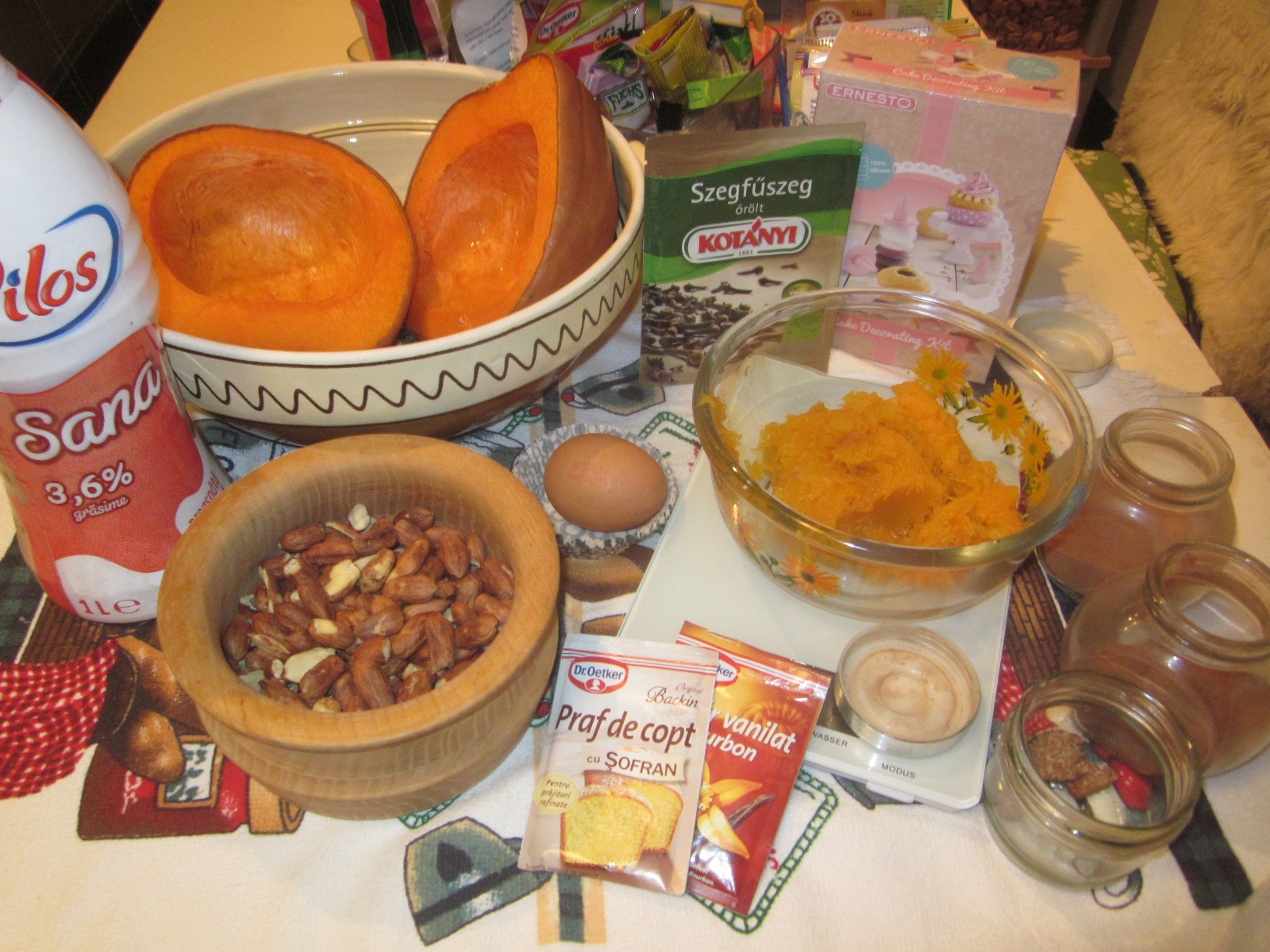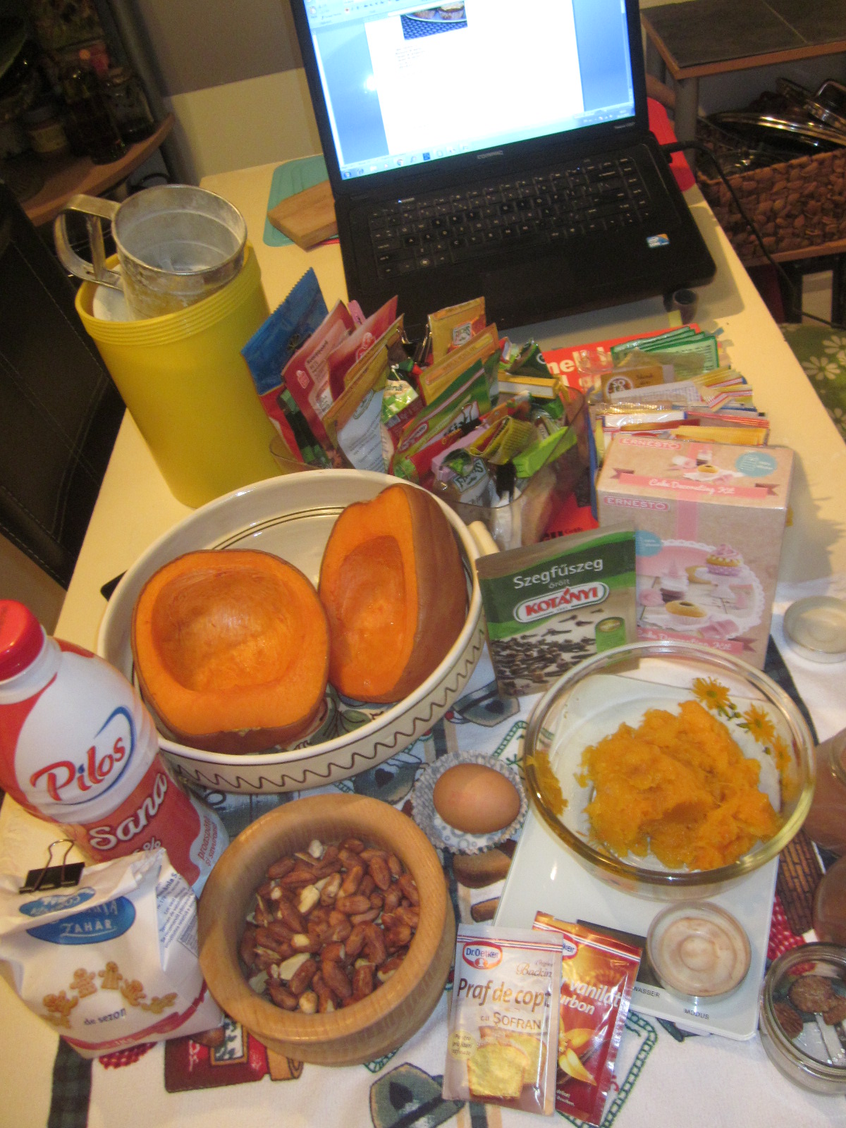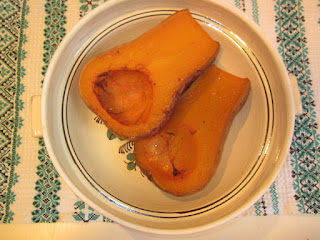 - Dovleacul se taie în două și se pune la copt în cuptor cca. 60 de minute la 200 grade. După ce s-a copt, se curăță de coajă și se trece prin blender sau aparat de mărunțit, ca să se obtină un piure fin.