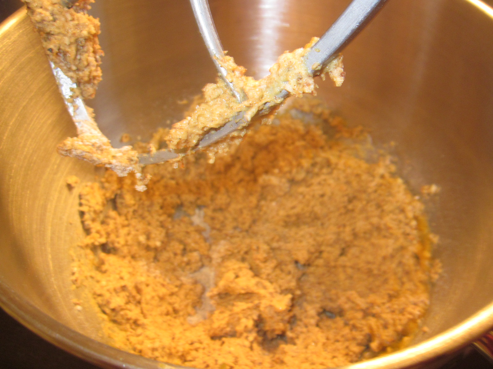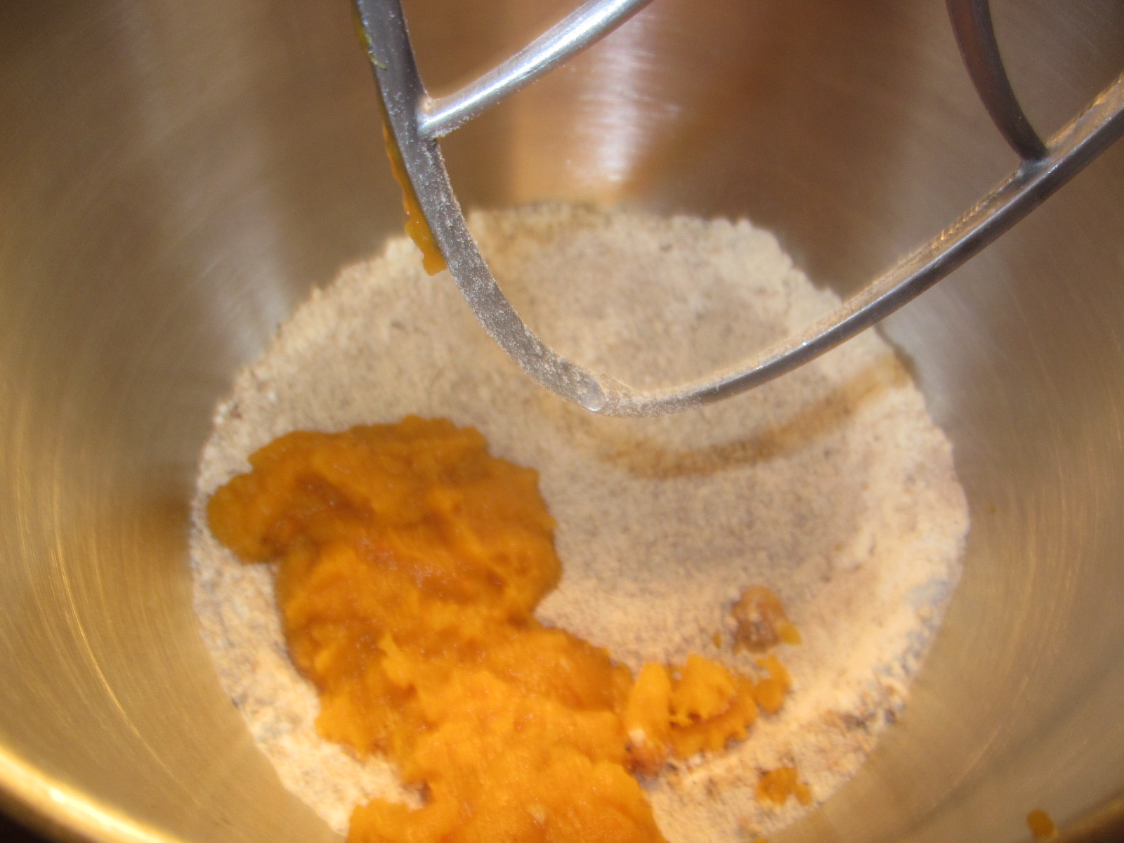 - Într-un vas încăpător se amestecă ingredientele uscate: zahărul tos și cel vanilinat, mirodeniile, praful de copt, amoniacul, făina, alunele mărunțite și piureul din dovleac copt.