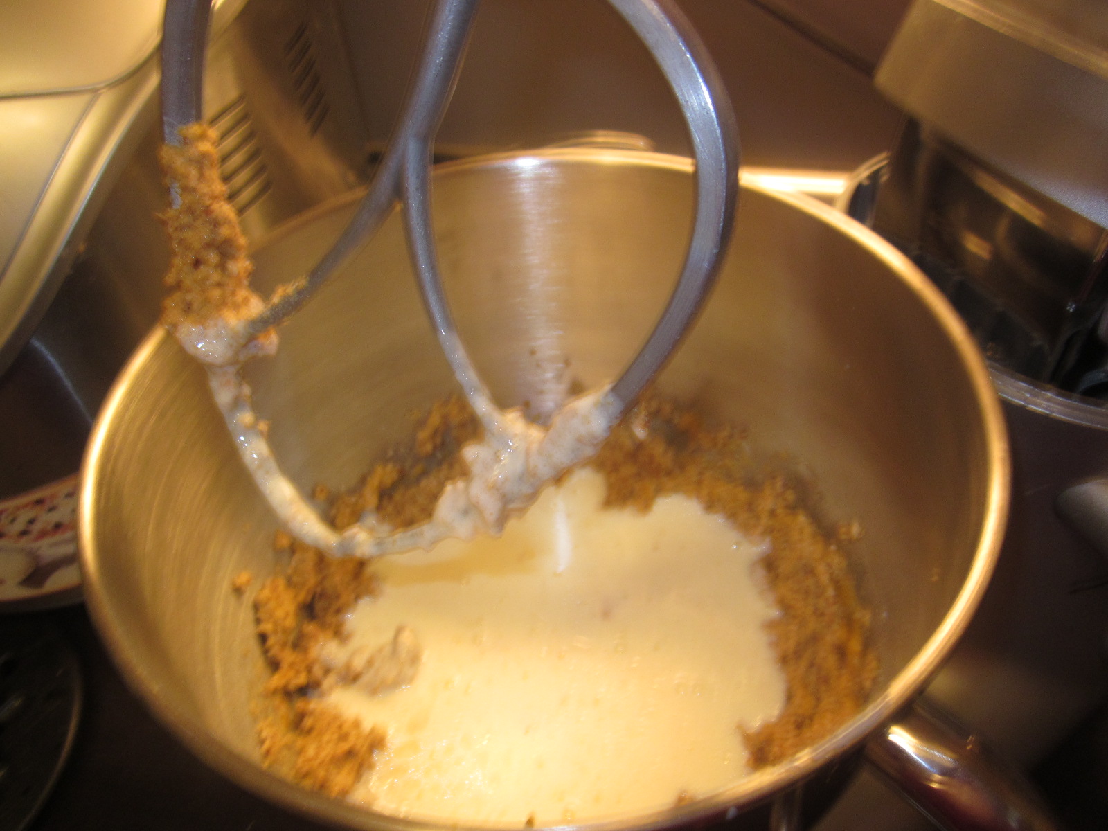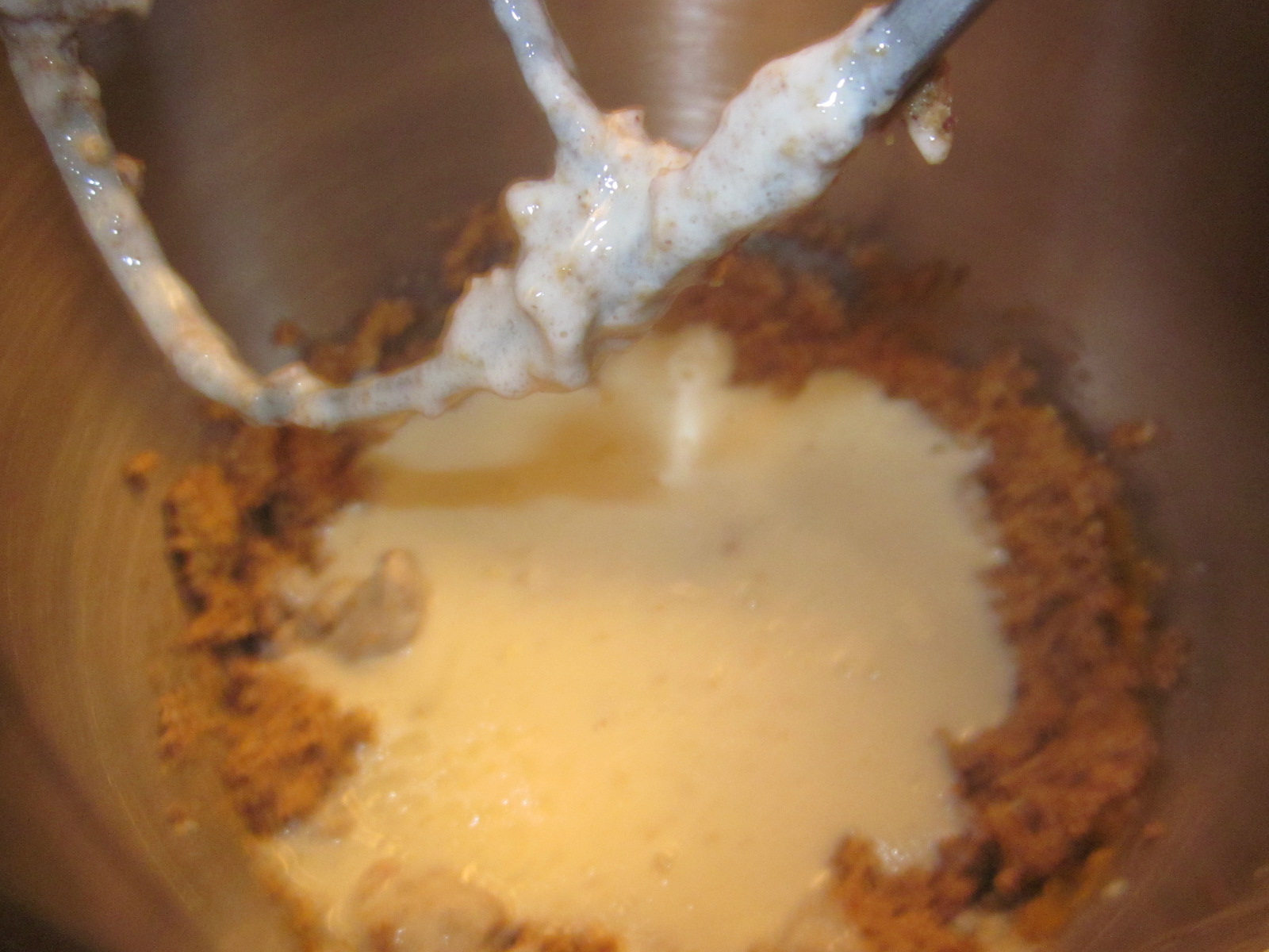 - Separat se amestecă energic oul, uleiul și sana. Compoziția rezultată se adaugă peste compoziția semi-uscată, amestecându-se ușor până ce se înglobează toate ingredientele.