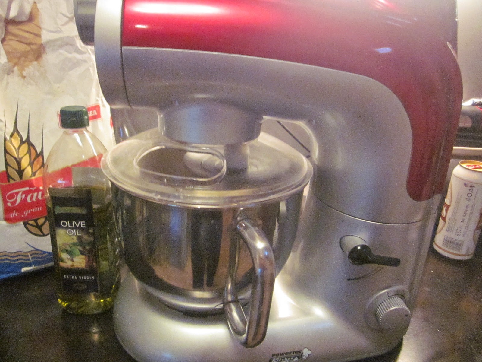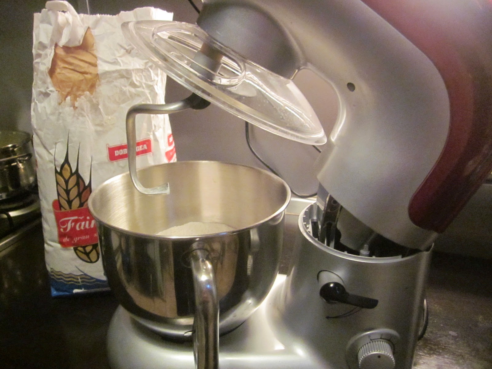 De data asta ajutorul a fost Thor, noul aparat din CasaZmeilor, un robot multifuncțional, asta că Maricica, mașina de preparat pâine, a ajuns la dezmebrări. Ei acum se schimbă ordinea efectuării operațiilor 😀 În vasul robotului se cerne făina, se adaugă sarea și uleiul de măsline, se pornește robotul, și se amestecă ușor ingredientele, până ce se omogenizează.
