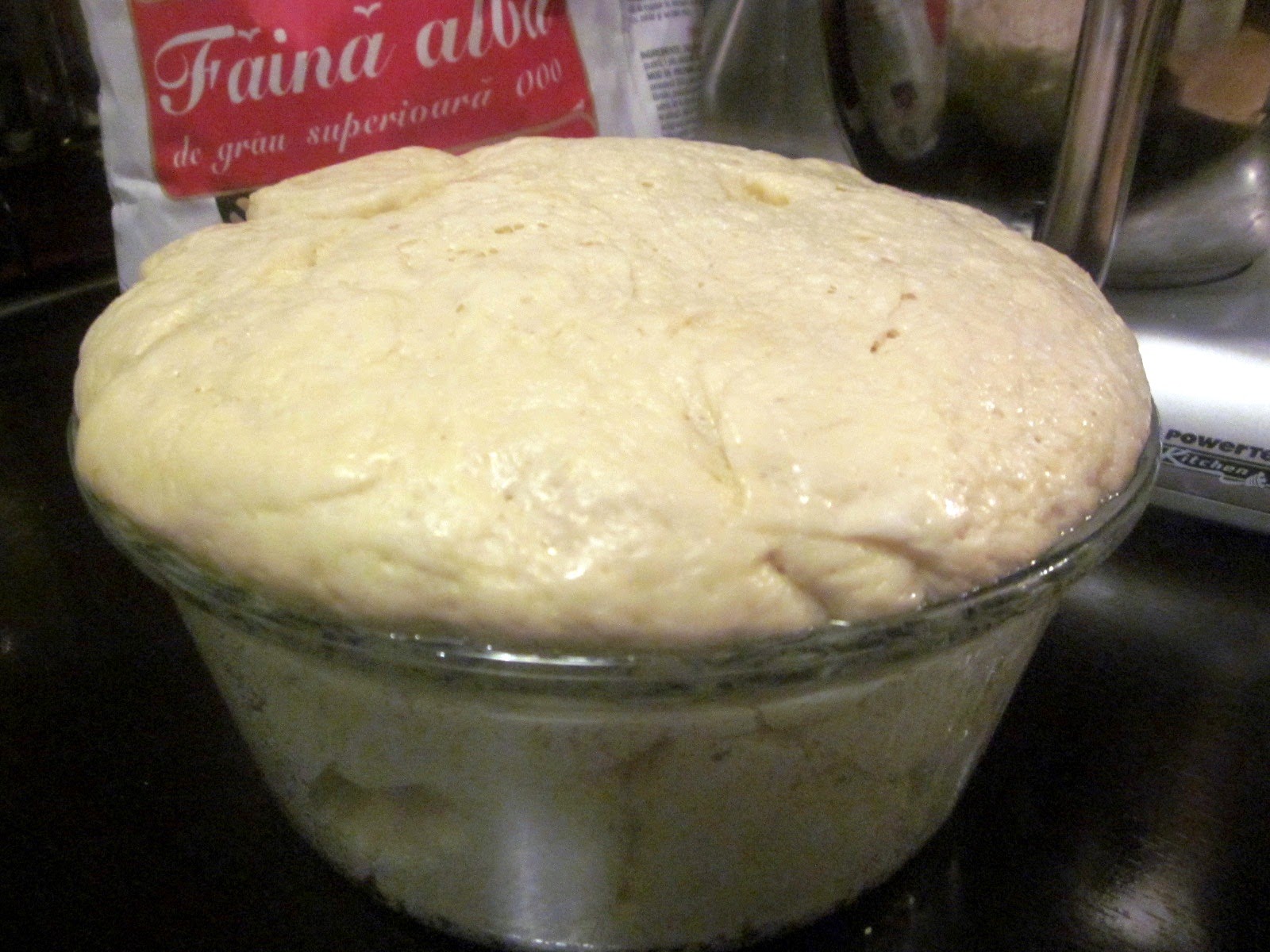 Apoi se scoate aluatul obținut și se pune într-un recipient de sticlă, uns cu ulei de măsline la dospit, acoperit cu folie dublă transparentă, cca 30 de minute. Rețeta inițială a dat un timp de cca 60 de minute, dar sincer nu a fost nevoie, că deja se scurgea din vas.