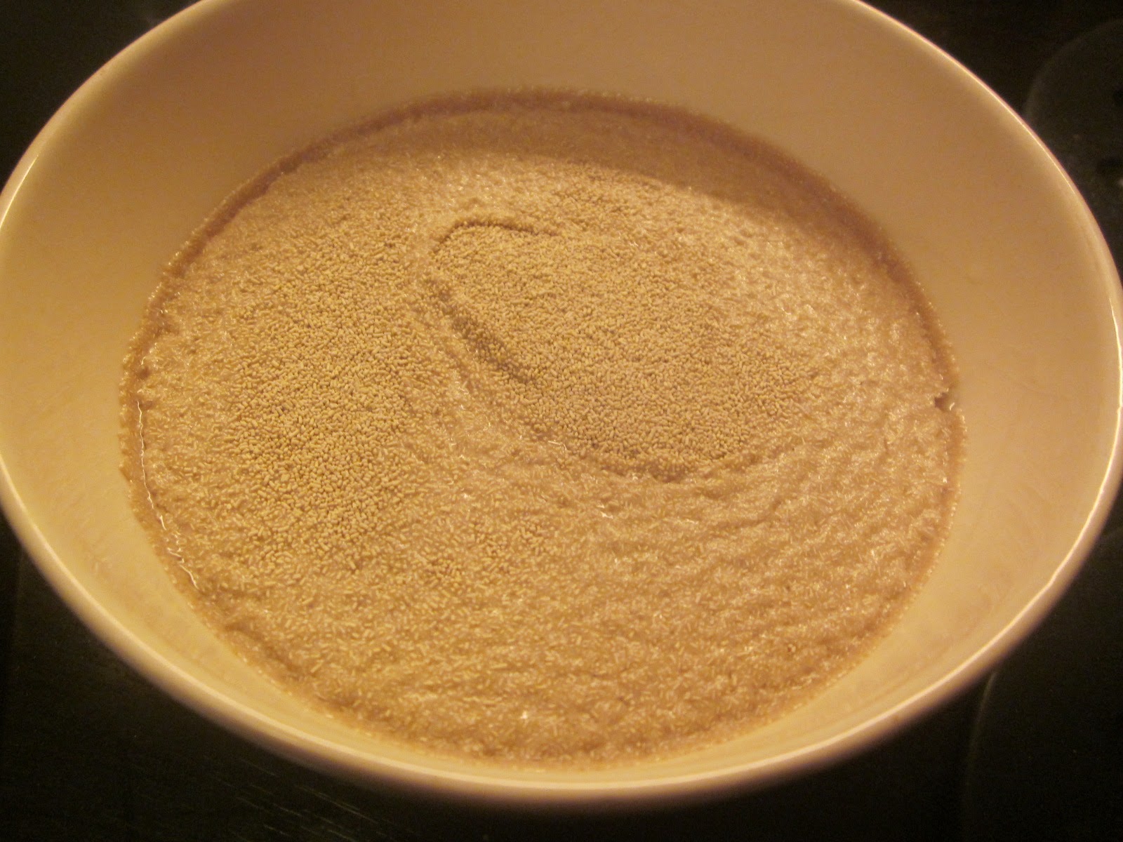 Între timp se pune apa călduță într-un recipient, se adaugă zahărul și drojida, se amestecă ușor și se lasă la odihnă, cca. 5 minute, până ce drojdia începe să facă bule.