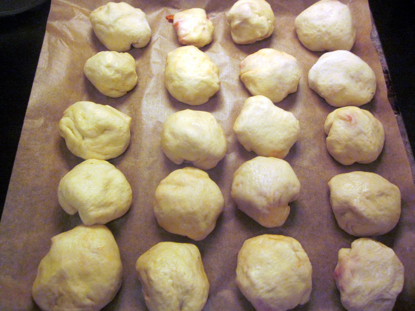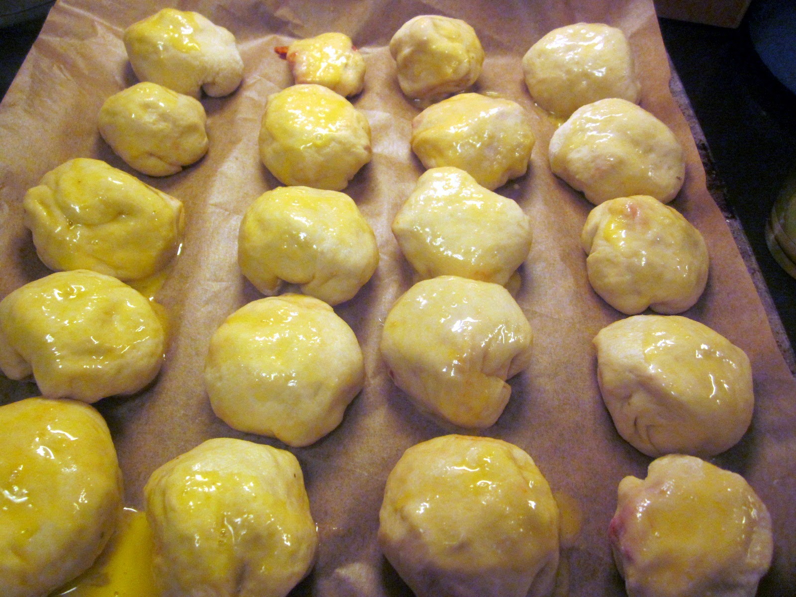 Fiecare pătrat se închide ca și un plic, apoi se rotunjește în mâini, ca să se obțină o chiflă uniformă, cât se poate. Chiflele obținute se pun în tava tapetată cu foaie de pergament, la ceva distanță între ele, atât cât să nu se unească.