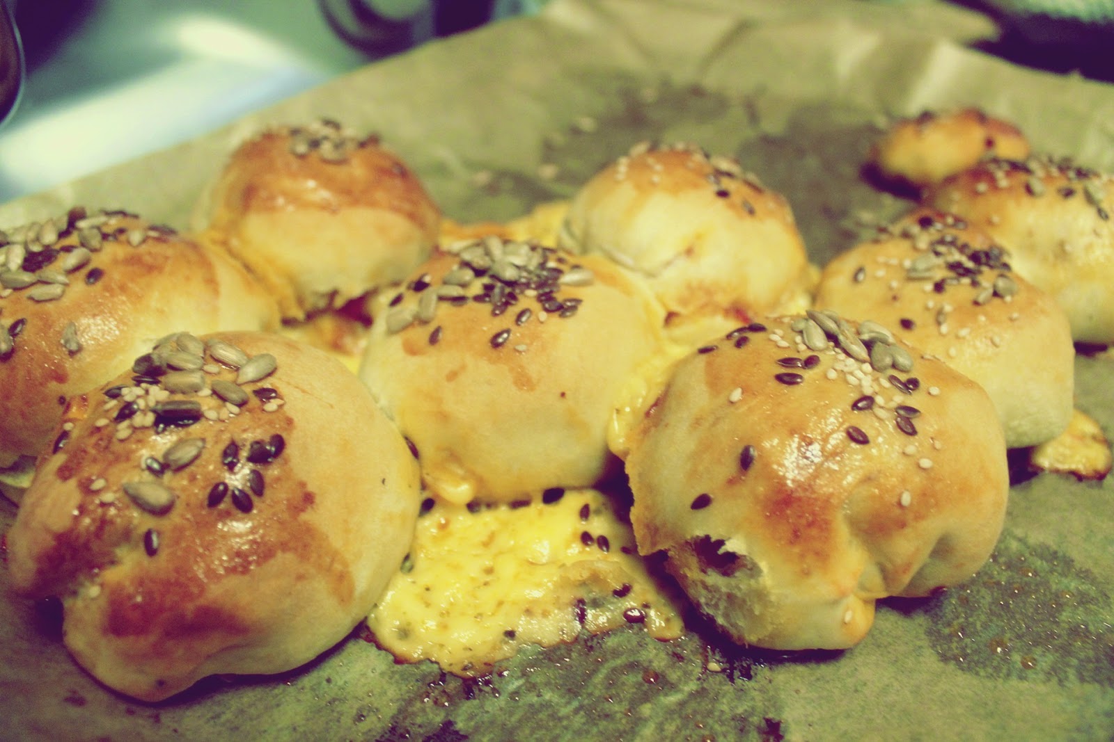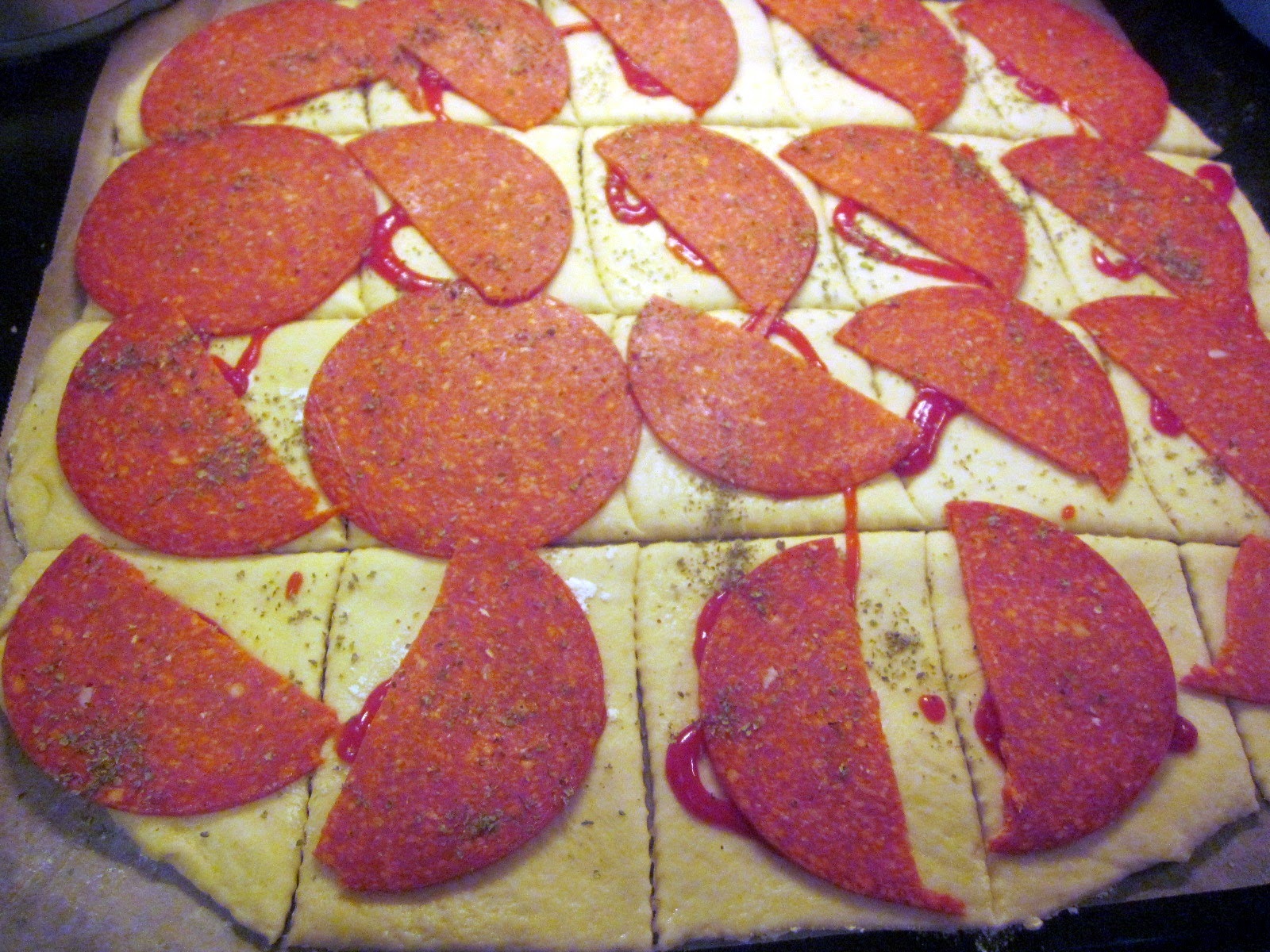 Bucăți de pizza cu salam cu ardei și brânză. Mulțumesc Corina pentru idee! Dispar instant din tavă, abia am apucat să fac câteva poze!