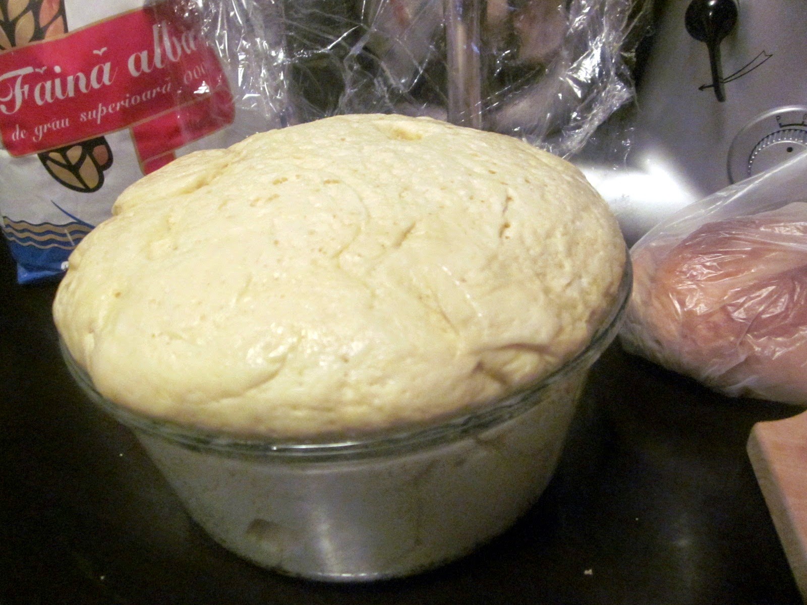 Apoi se scoate aluatul obținut și se pune într-un recipient de sticlă, uns cu ulei de măsline la dospit, acoperit cu folie dublă transparentă, cca 30 de minute. Rețeta inițială a dat un timp de cca 60 de minute, dar sincer nu a fost nevoie, că deja se scurgea din vas.