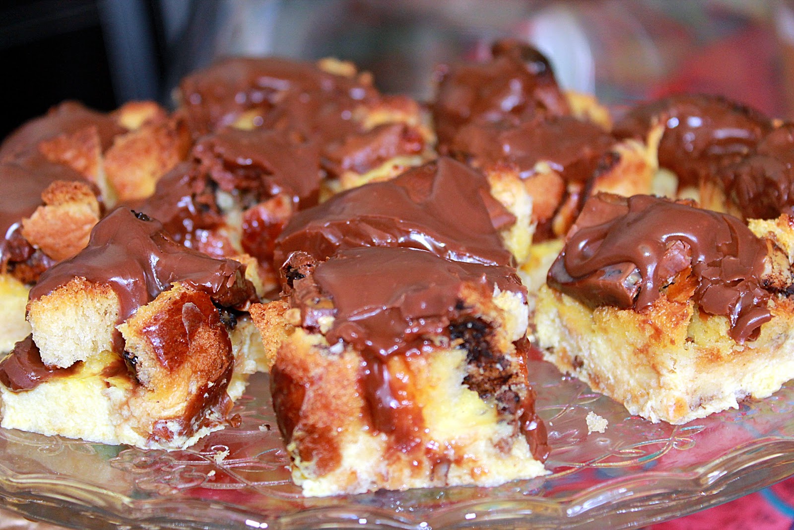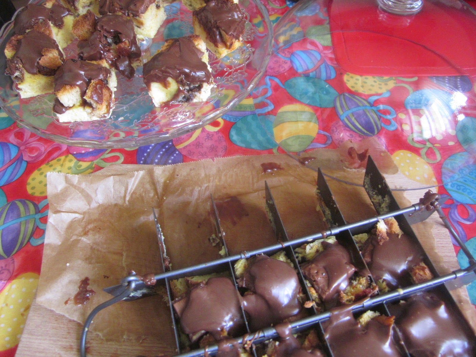 După ce a expirat timpul de coacere, de data asta nu e necesar să faceți testul scobitorii :D, cozonacul e copt de câteva zile :D, iar amestecul de ouă, lapte și frișcă lichidă se încheagă imediat. Se toarnă glazura de ciocolată peste budincă și se la la răcit cca. 20 de minute.