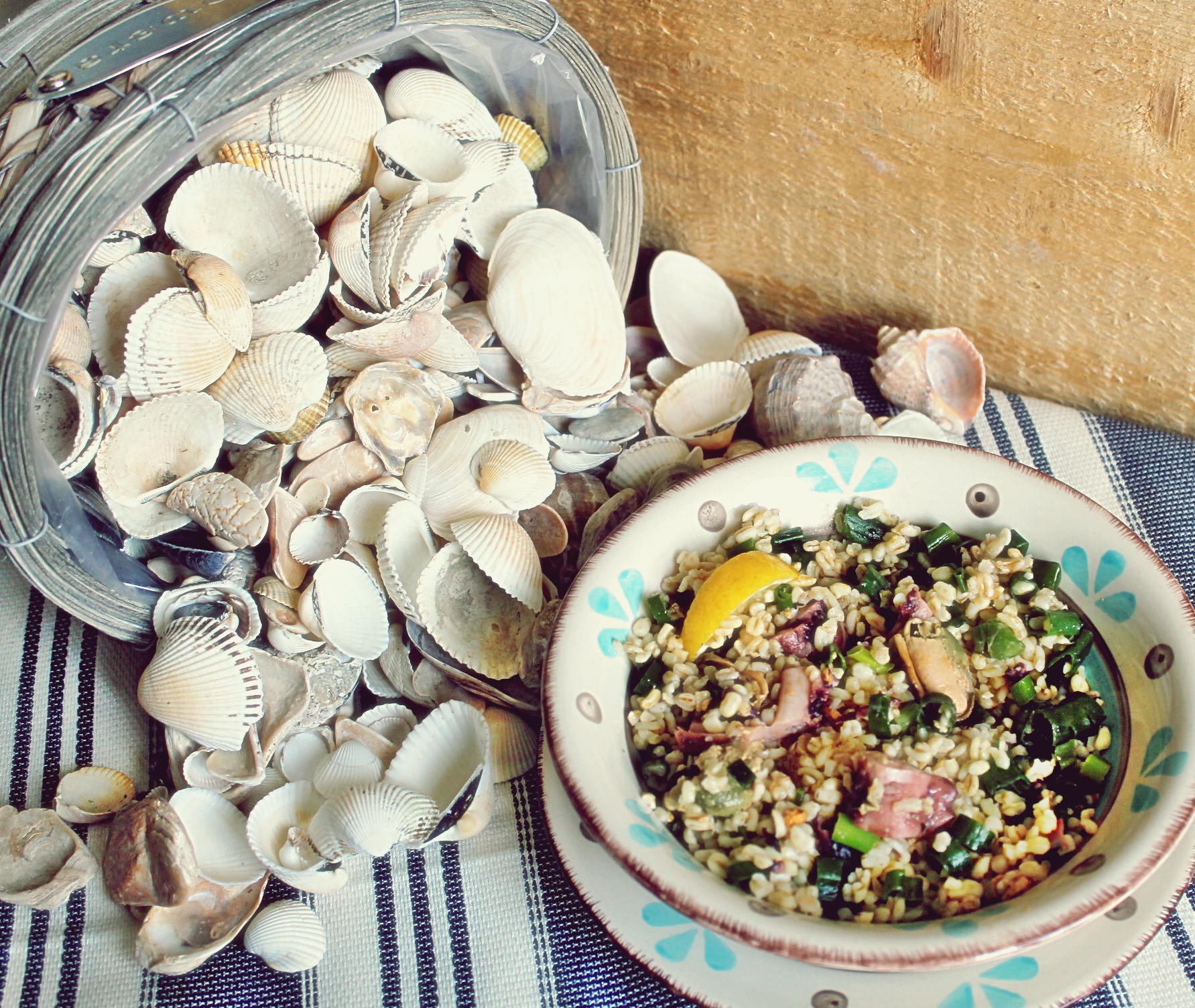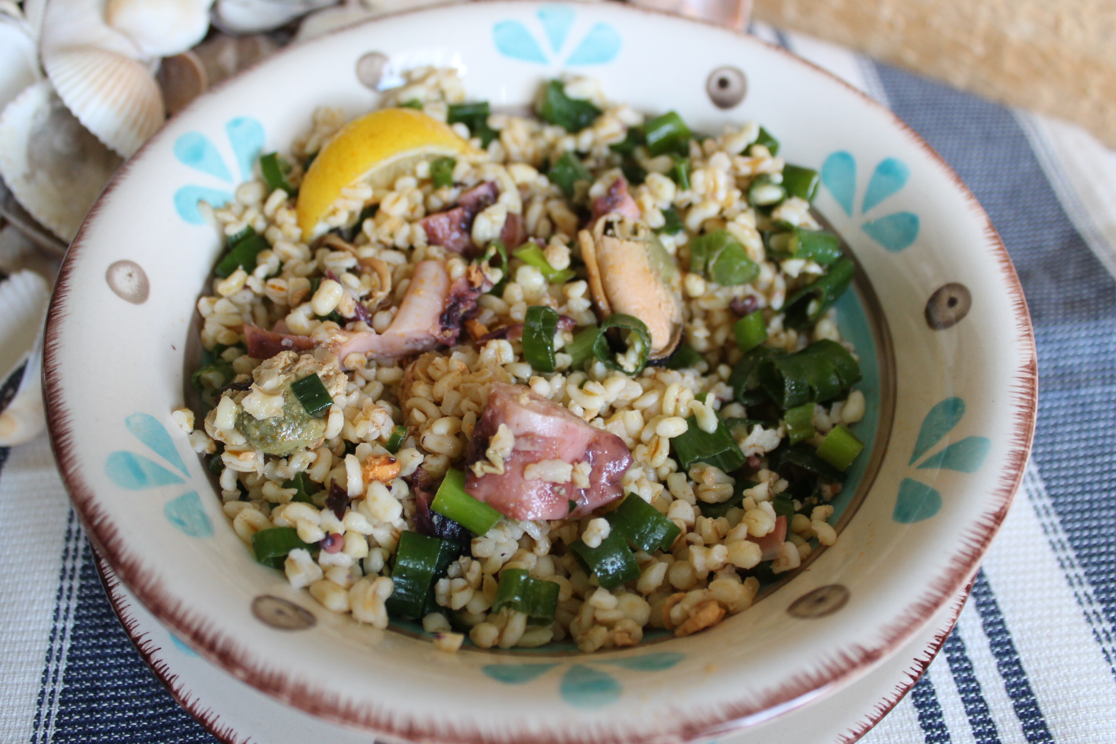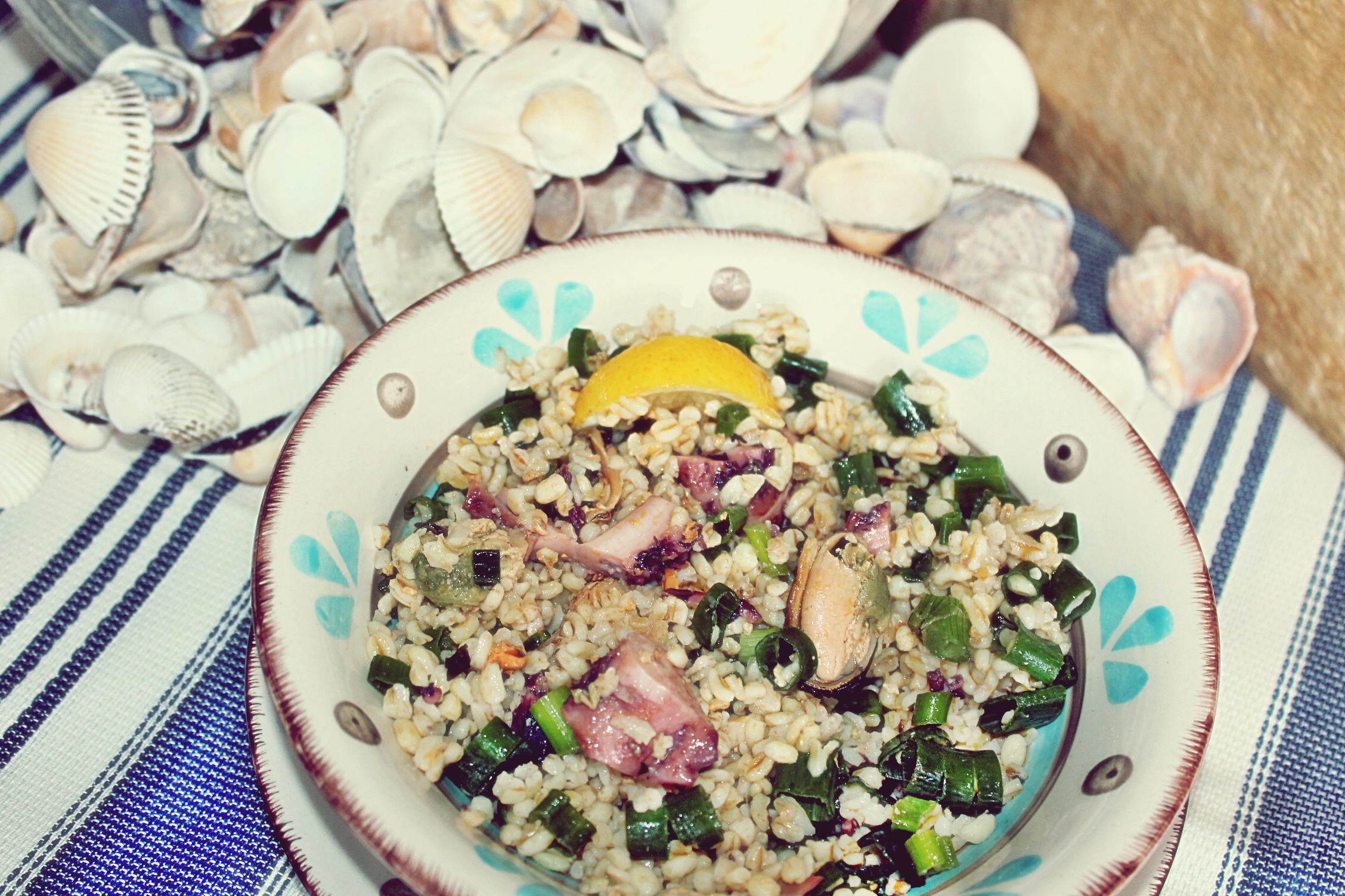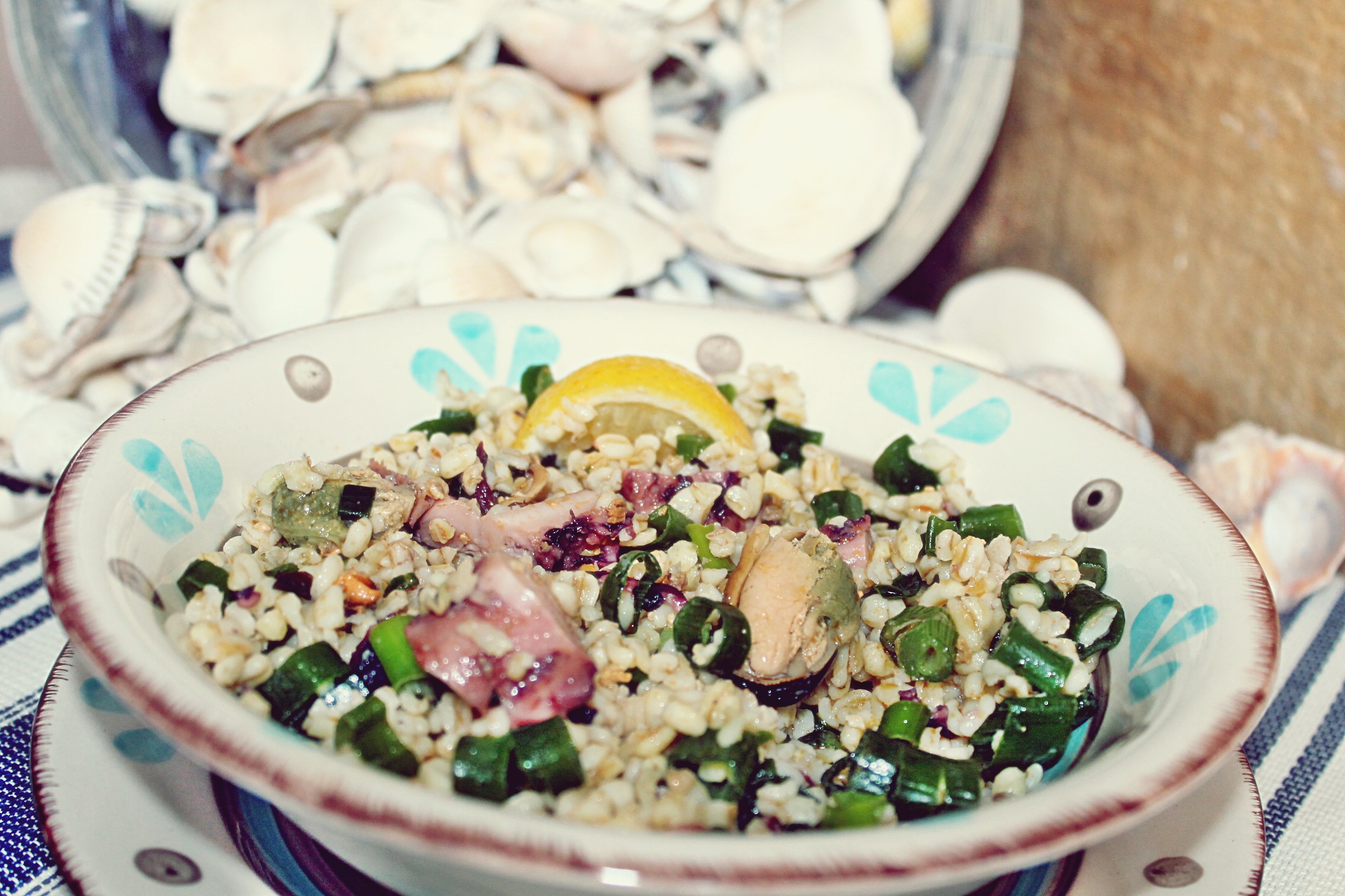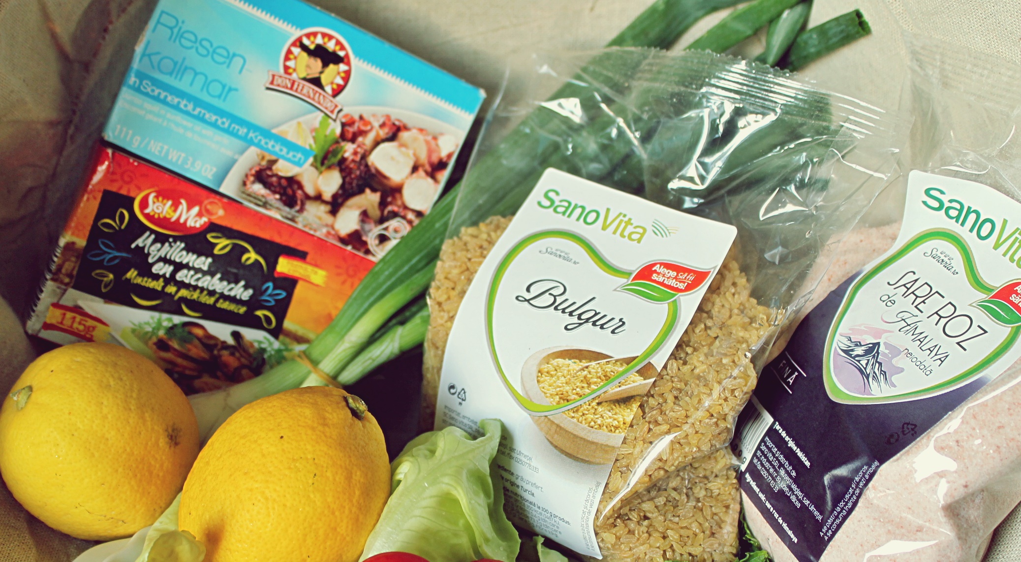 - După ce bulgurul a absorbit tot lichidul se adaugă: ceapa verde curățată, tocată mărunt, midiile și tentaculele de caracatiță, scurse de uleiul din conservă, zeama celor două lămâi.