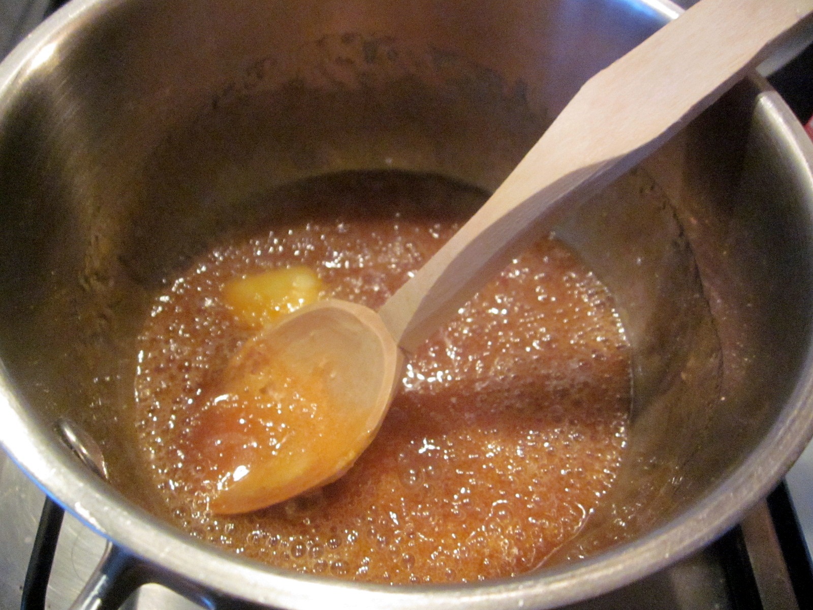 - Într-o crăticioară cu fundul gros și mai ales cu coadă lungă, [de ce?? o să întrebați, deoarece caramelul e foarte fierbinte, iar când se adaugă untul și smântâna, se degajă aburi fierbinți și e pericol de opărire!], să revin, se pune la topit la foc mediu zahărul, amestecându-se ușor, până se obține un lichid auriu, atenție, dacă devine maroniu, va fi amar.