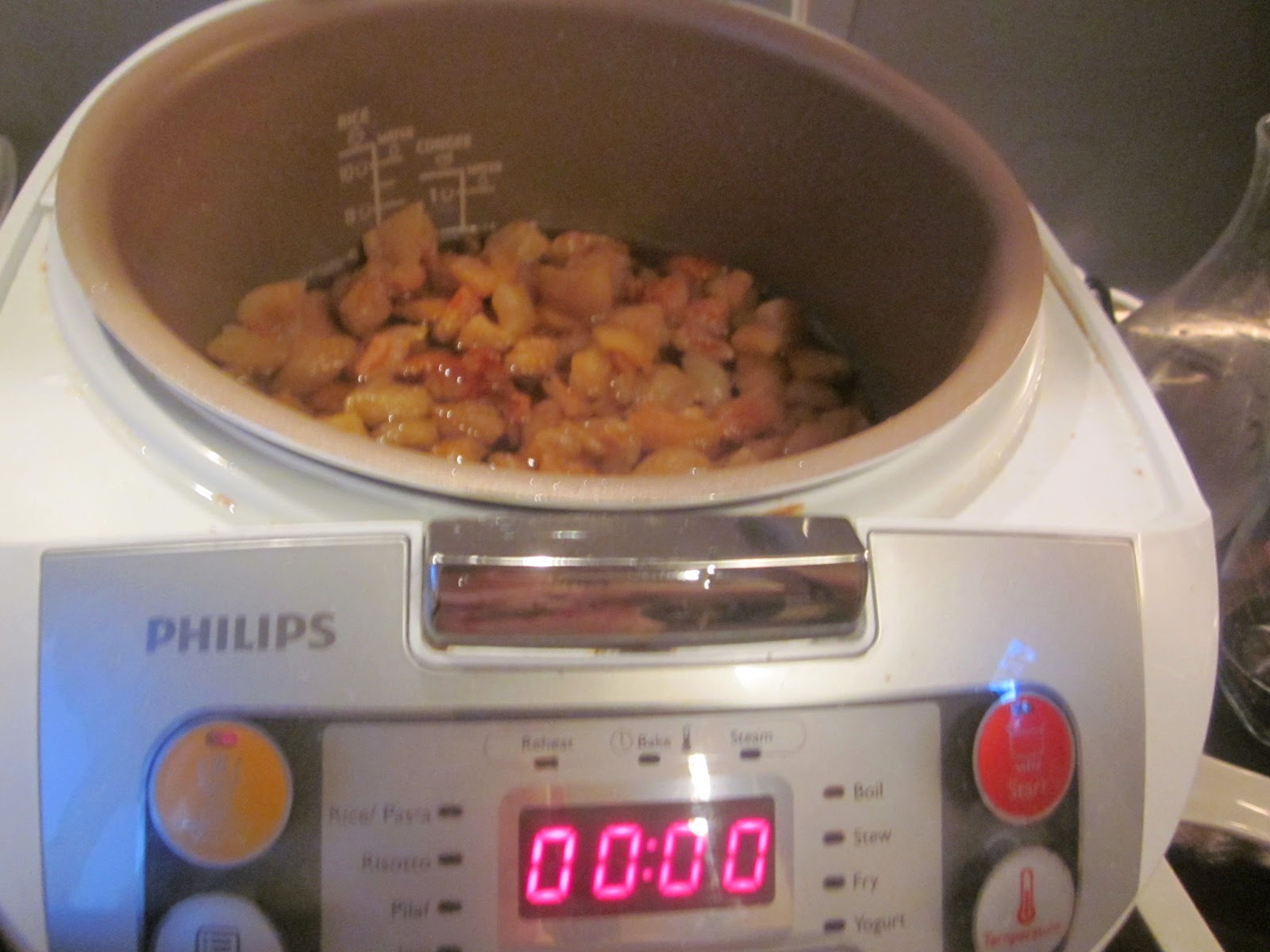 Din când în când se mai amestecă bucățile de slănină. Nu vă faceți probleme, garantez că și neamestecate nu se lipesc de fundul vasului. Așa după cele 45 de minute de prăjeală, mai setați încă odată aparatul, tot la 45 de minute;)