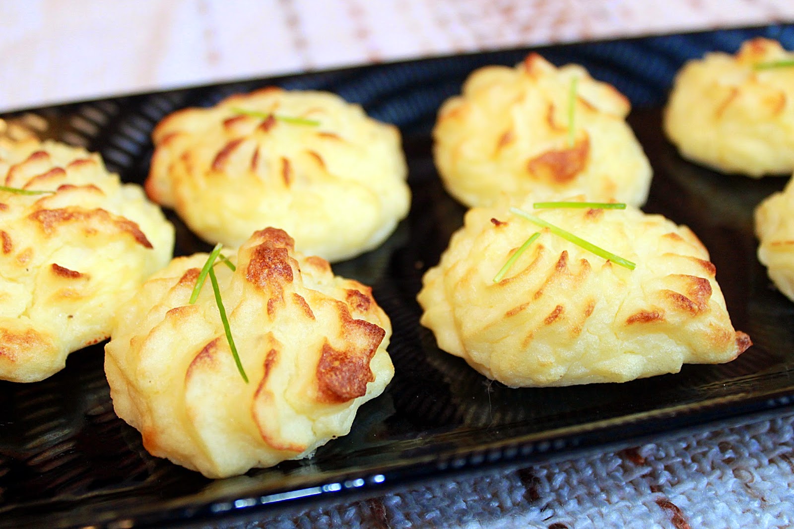 - Piureul din cartofi, se amestecă energic cu cele două ouă, se asezonează de sare și piper, apoi se umple poșul și se trece la treabă. Se formează mici ”bezele” din cartofi, ce se dau la copt într-o tavă tapetată cu foaie de pergament, cca. 20 de minute la 200 grade.