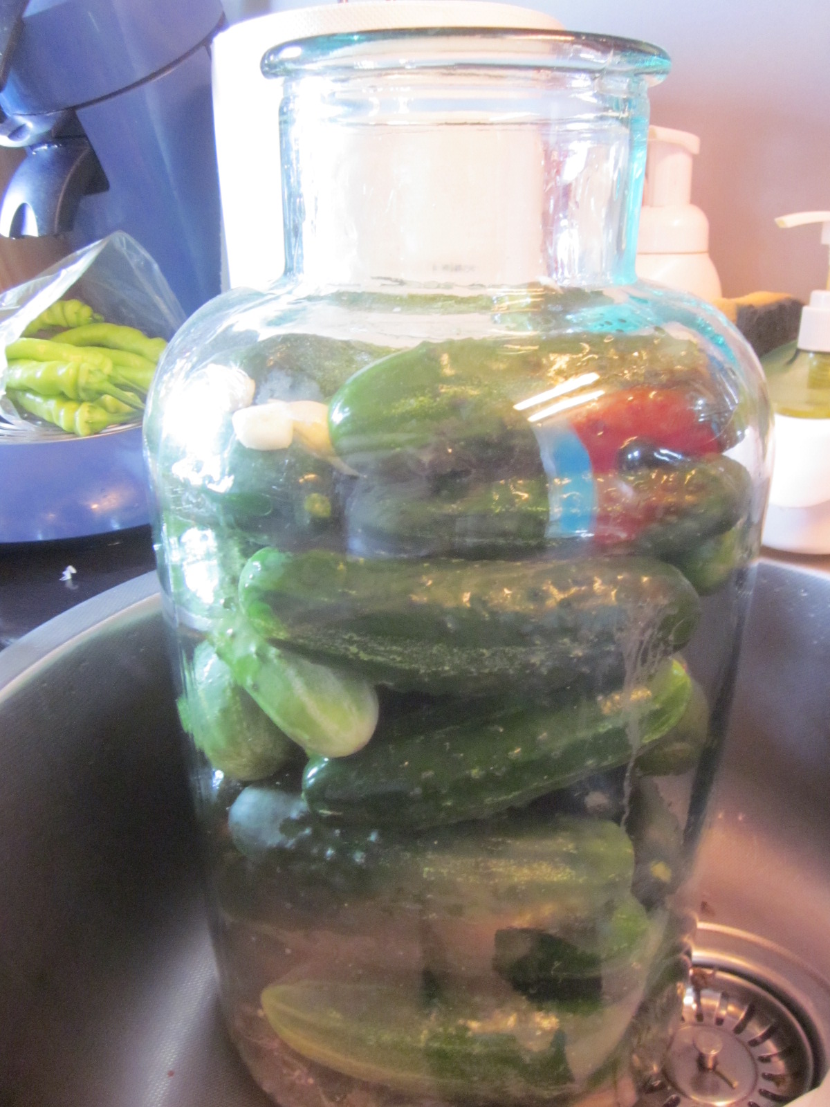 - Se asezonează de usturoi, și ardei iute, iar la final, pâinea împachetată în tifon, sau o pânză subțire se punea deasupra castraveților, astfel încât să fie acoperită de saramură. Pâine ajută la fermentare, ceea ce permite să avem castraveți murați la soare în minim 2 zile da caniculă, sau 4 zile călduroase. Nu vă impacientați dacă lichidul se va tulbura, face parte din procesul de murare. După ce castraveții au prins o culoare kaki, gen uniforme de armată 😀