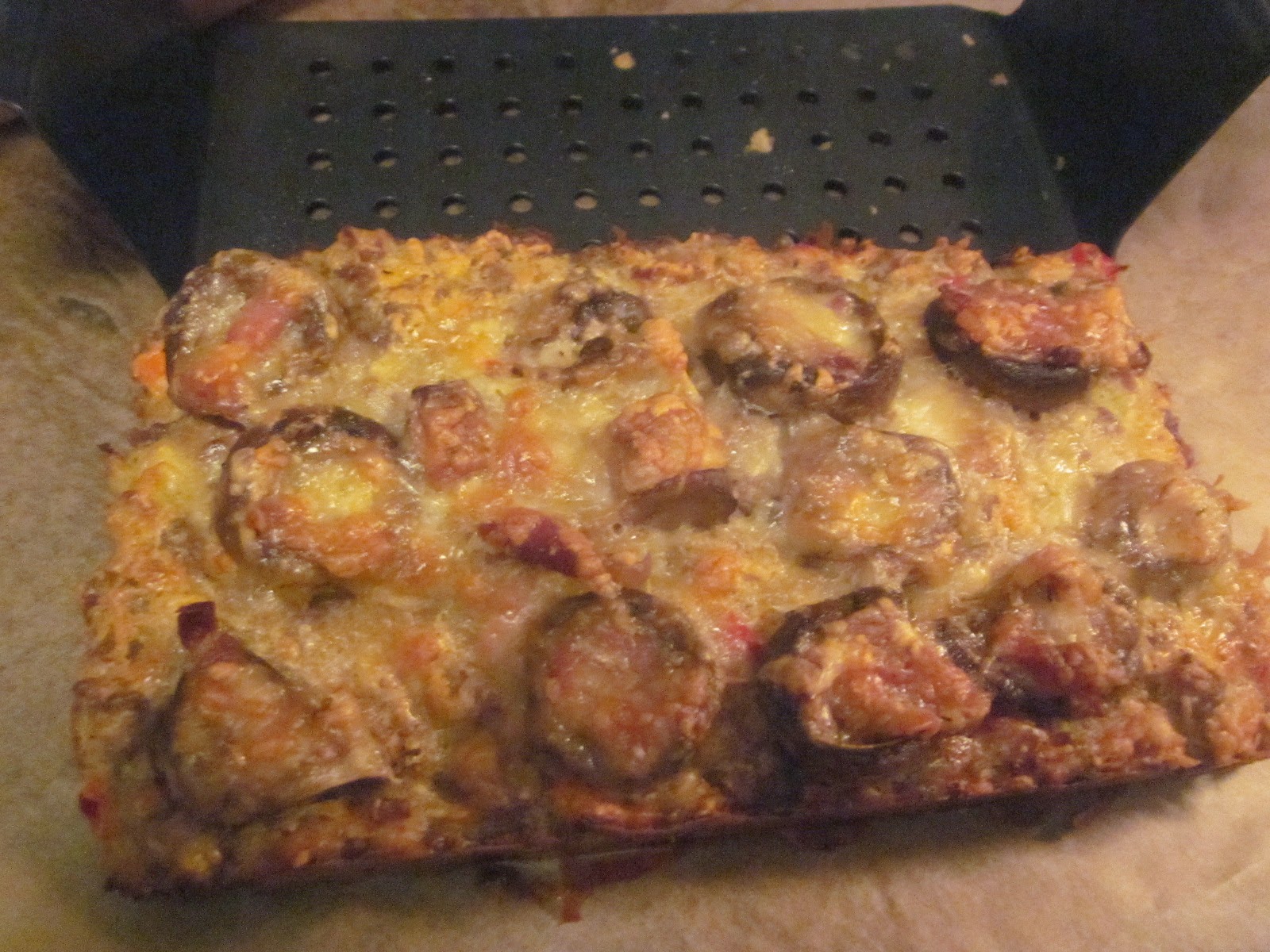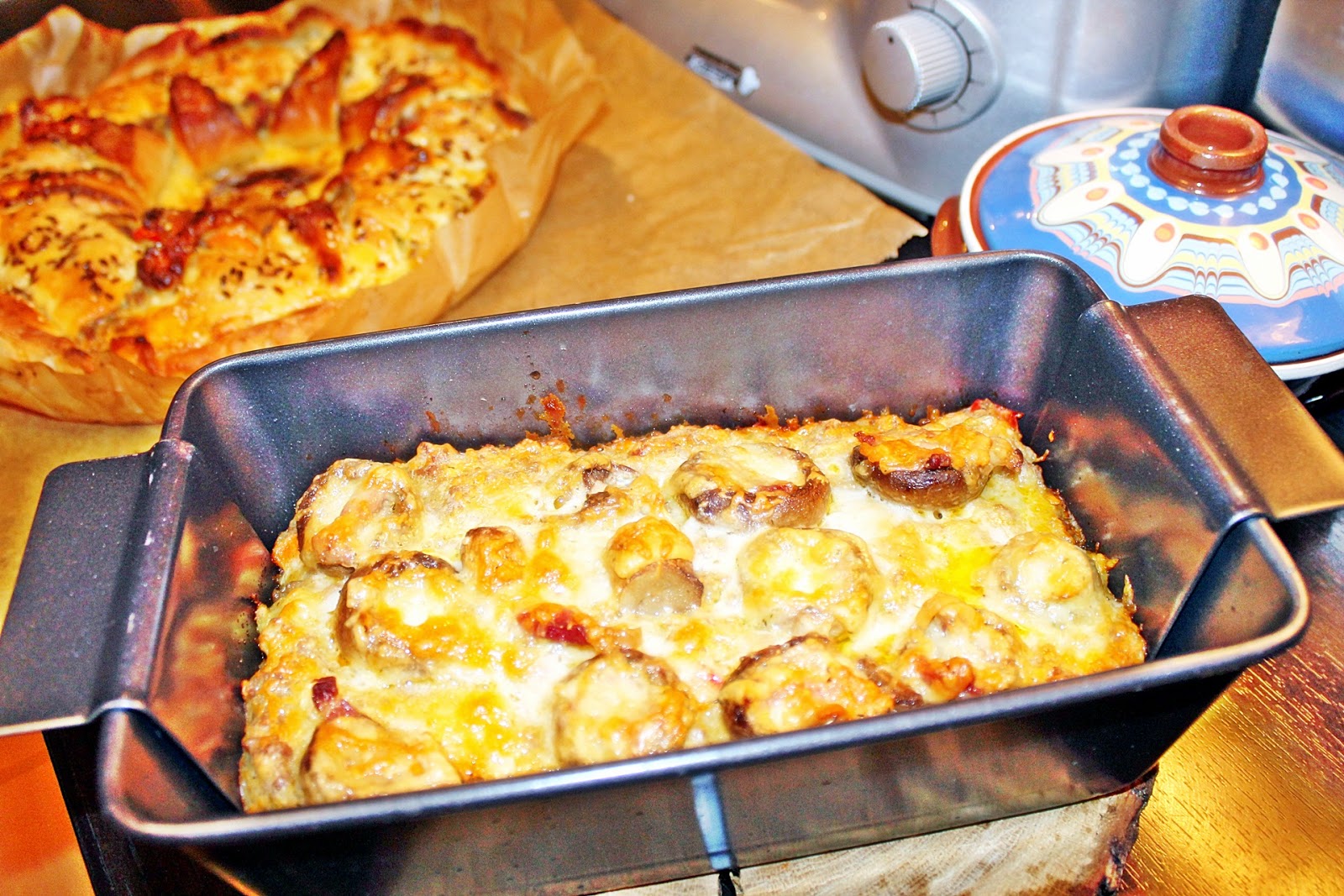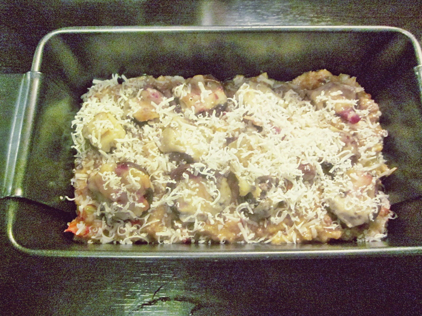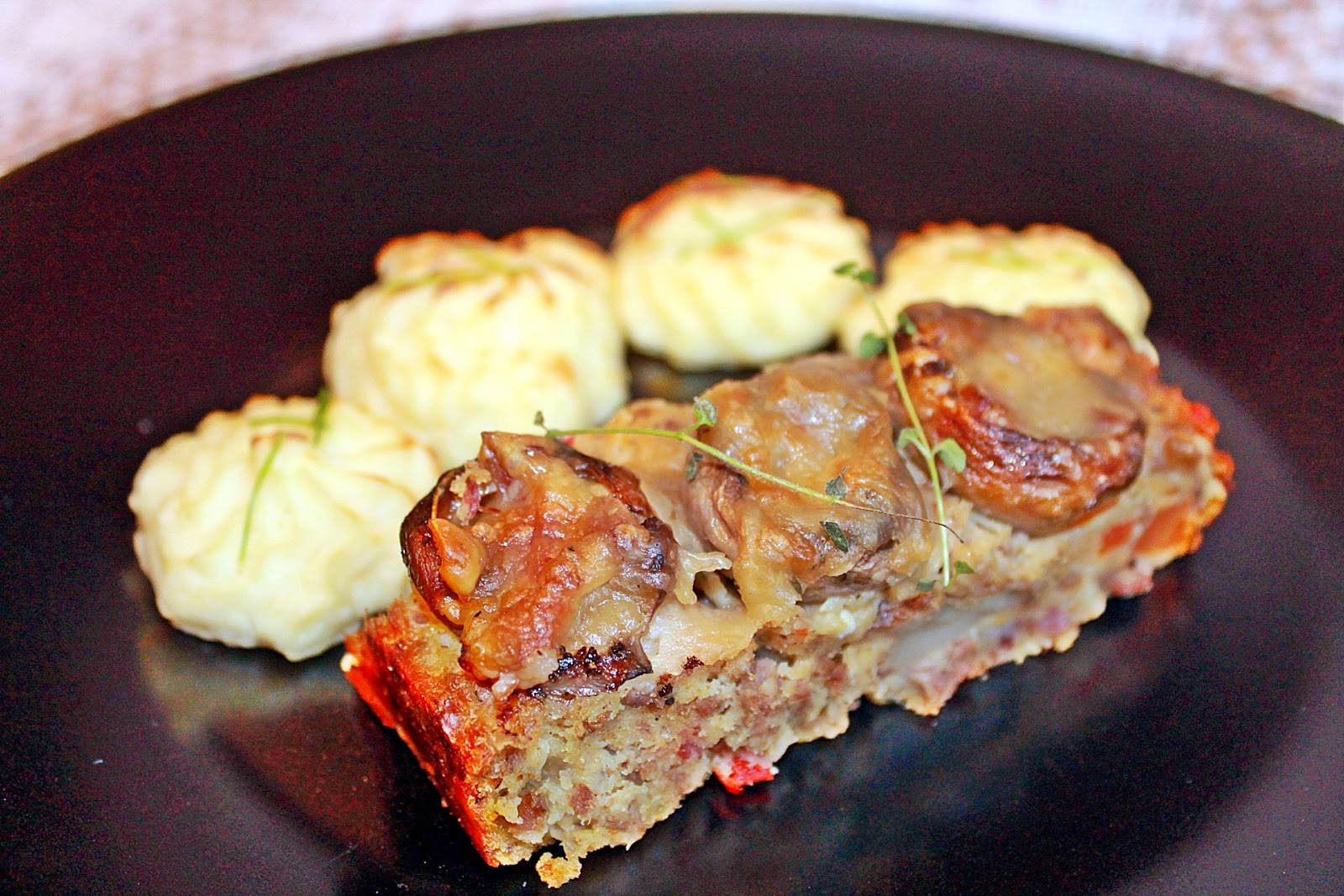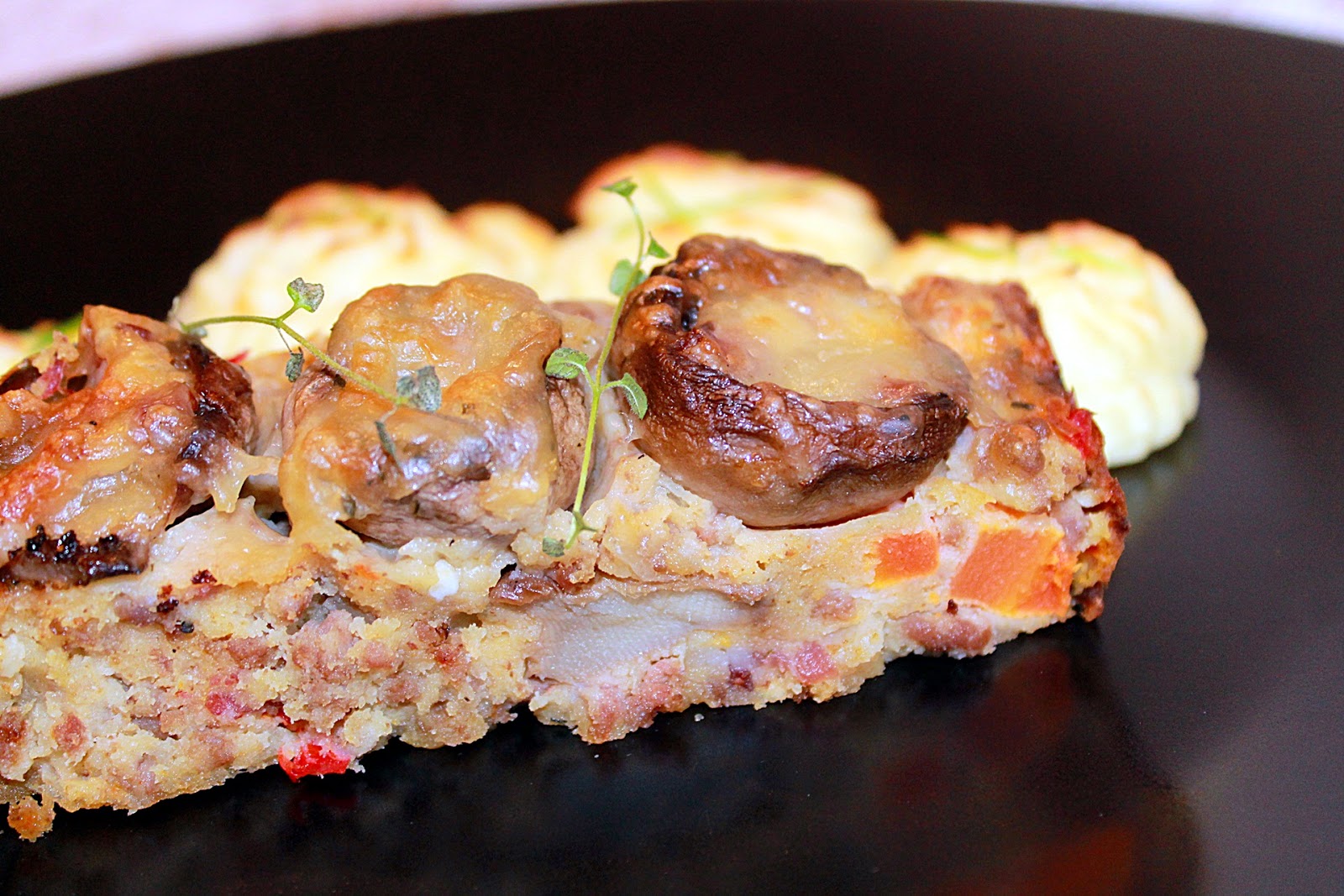 - După odihnă, amestecul de carne tocată se așează în tava special pentru preparate din carne tocată :D, sau într-o formă de chec tapetată cu foaie de pergament și se ornează cu ciupercile umplute și cașcavlul ras.