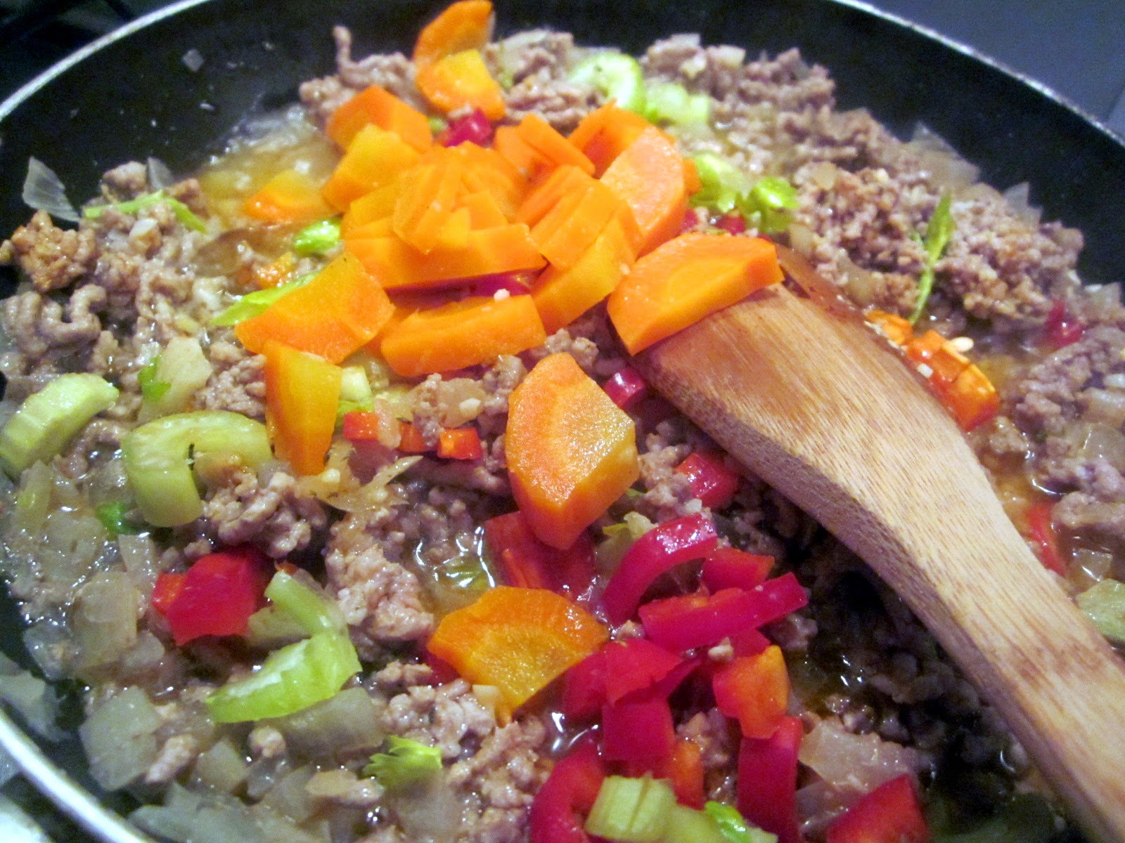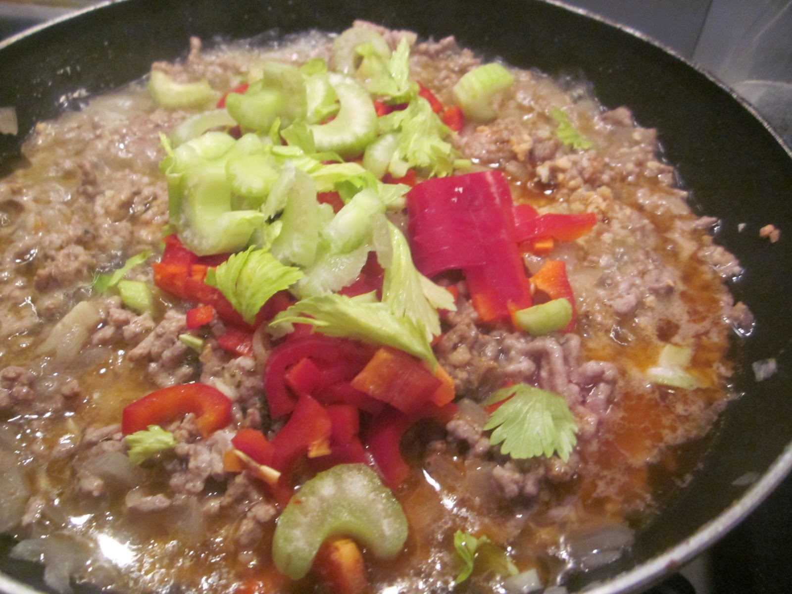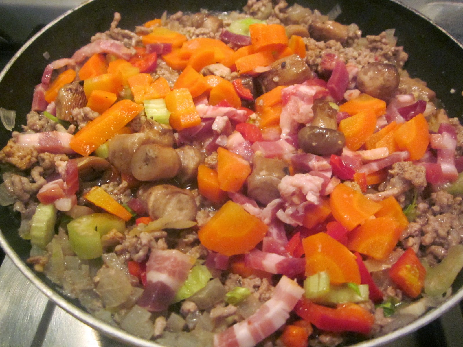 - Ceapa curățată și tocată mărunt se pune la dinstuit cu puțină apă și ulei de măsline, se adaugă apoi ardeiul kapia tocat mărunt, țelina apoi de asemenea tocată, usturoiul mărunțit, baconul tocat, asezonându-se de sare, piper și boia.