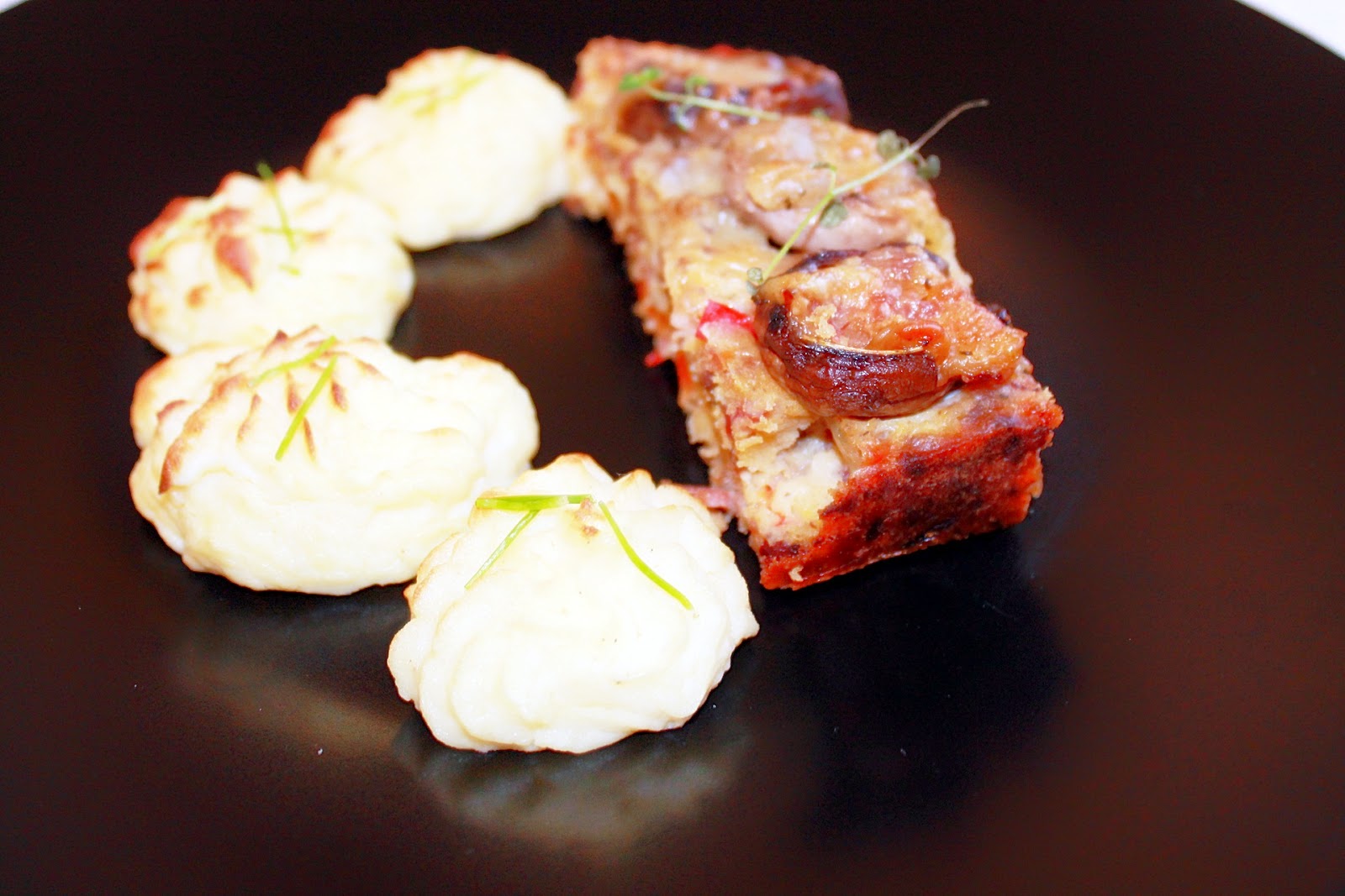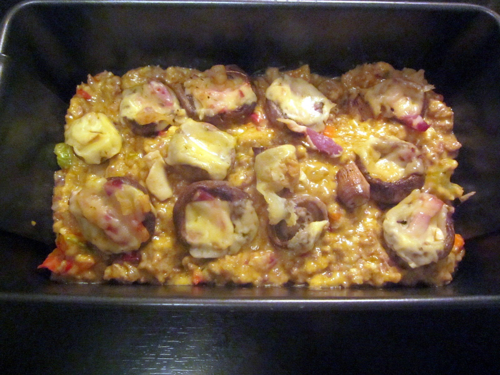 • După odihnă, amestecul de carne tocată se așează în tava special pentru preparate din carne tocată :D, sau într-o formă de chec tapetată cu foaie de pergament și se ornează cu ciupercile umplute și cașcavlul ras.