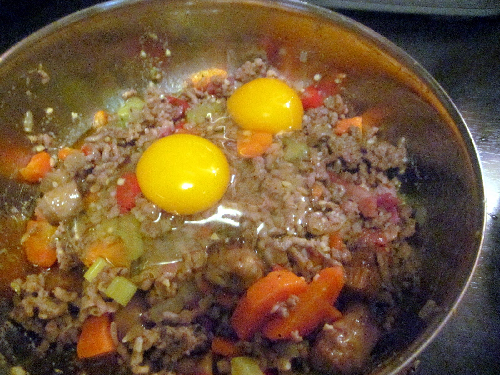 • După ce s-au îmbinat toate ingredientele se adaugă ouăle și grișul, amestecându-se ușor până ce se înglobează toate ingredientele și se lasă la odihnă cca. 10 minute. Între timp se pregătesc ciupercile umplute pentru topping. Rețeta aici: