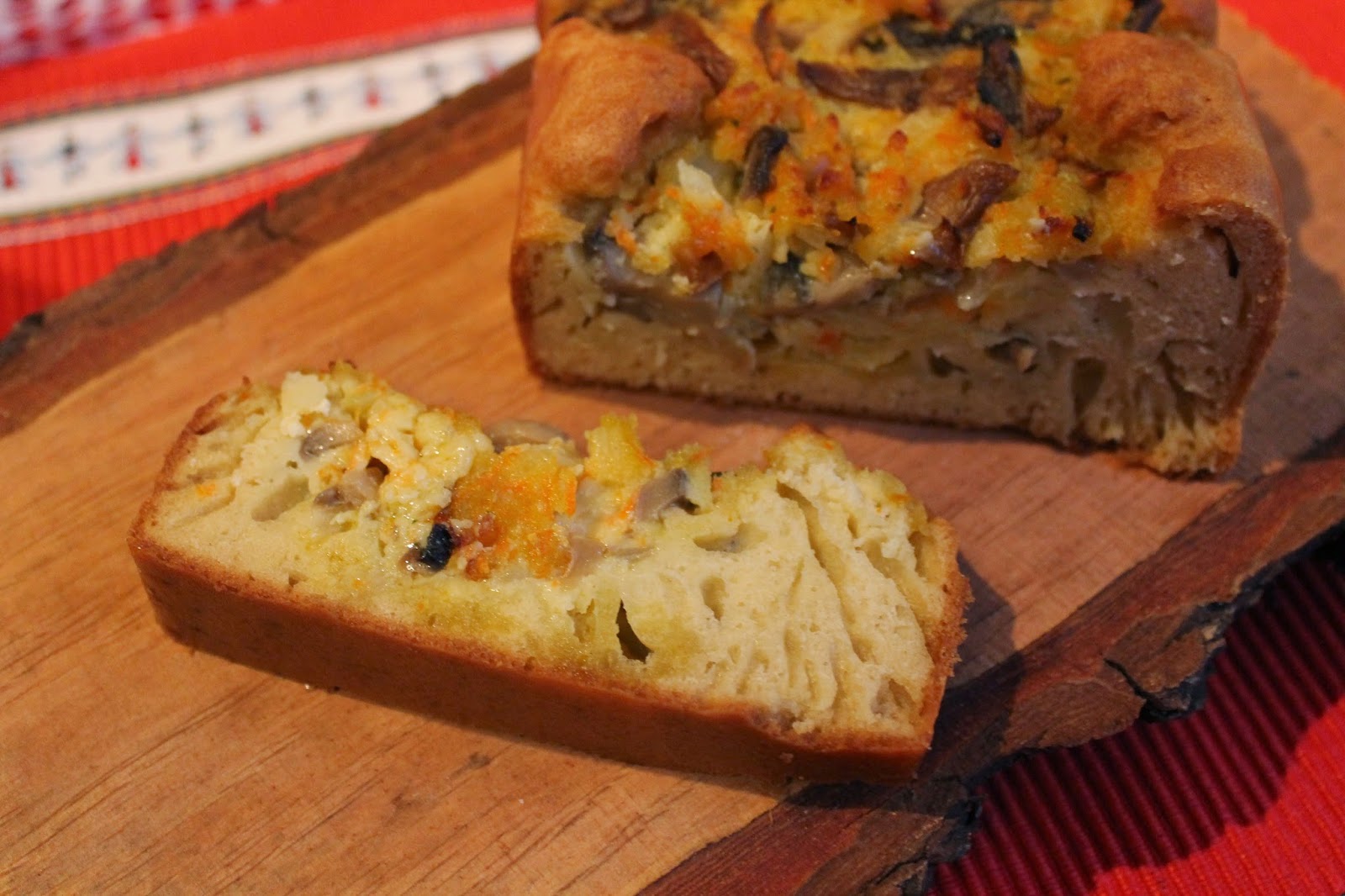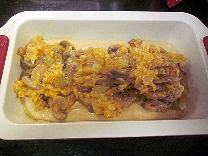 • Din această compoziție se iau două linguri și se adaugă amestecului de ciuperci. Intr-o tavă de chec tapetată cu hârtie de pergament se toarnă aluatul, iar în mijloc se pune ușor cu lingura umplutura. Se pune la copt în cuptorul preîncins cca. 35 de minute la 200 grade.