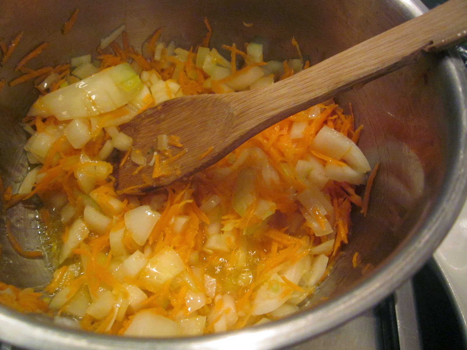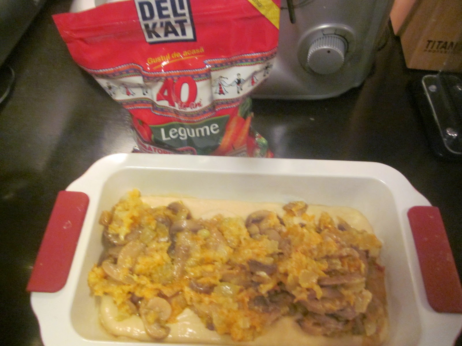 • Prima oară se pregătește umplutura. Ceapa și morcovul curățate se toacă mărunt, apoi se călesc în puțin ulei, până devin translucide. Apoi se adaugă ciupercile scurse de lichidul din conservă, tocate mărunt, asezonându-se cu sare iodată, lăsându-se la călit încă vreo 3 minute. Umpultura se lasă la răcit până ce se pregătește aluatul.