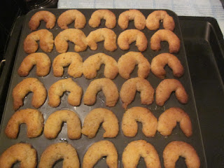 - Cornulețele se coc, în cuptorul preîncălzit cca. 25 de minute la 180 grade;) După ce s-a rumenit ”talpa”, zicere de la Dia 😉 se scot, din cuptor și se tăvălesc, fierbinți în pudră de zahăr 😉