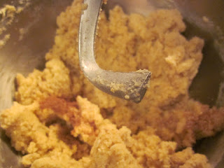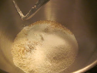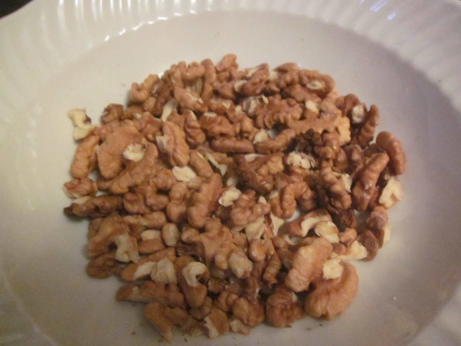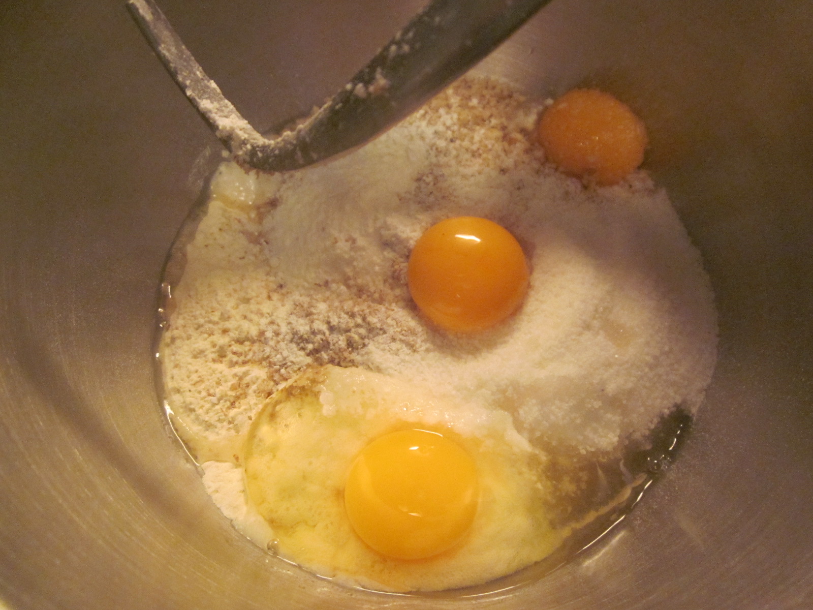 - Întâi se amestecă ingredientele uscate: făina, praful de copt, miezul de nucă măcinat, zahărul și zahărul vanilinat. În mix-ul de ingrediente uscate se adaugă ouăle, amestecându-se eneregic, până ce se înglobează.