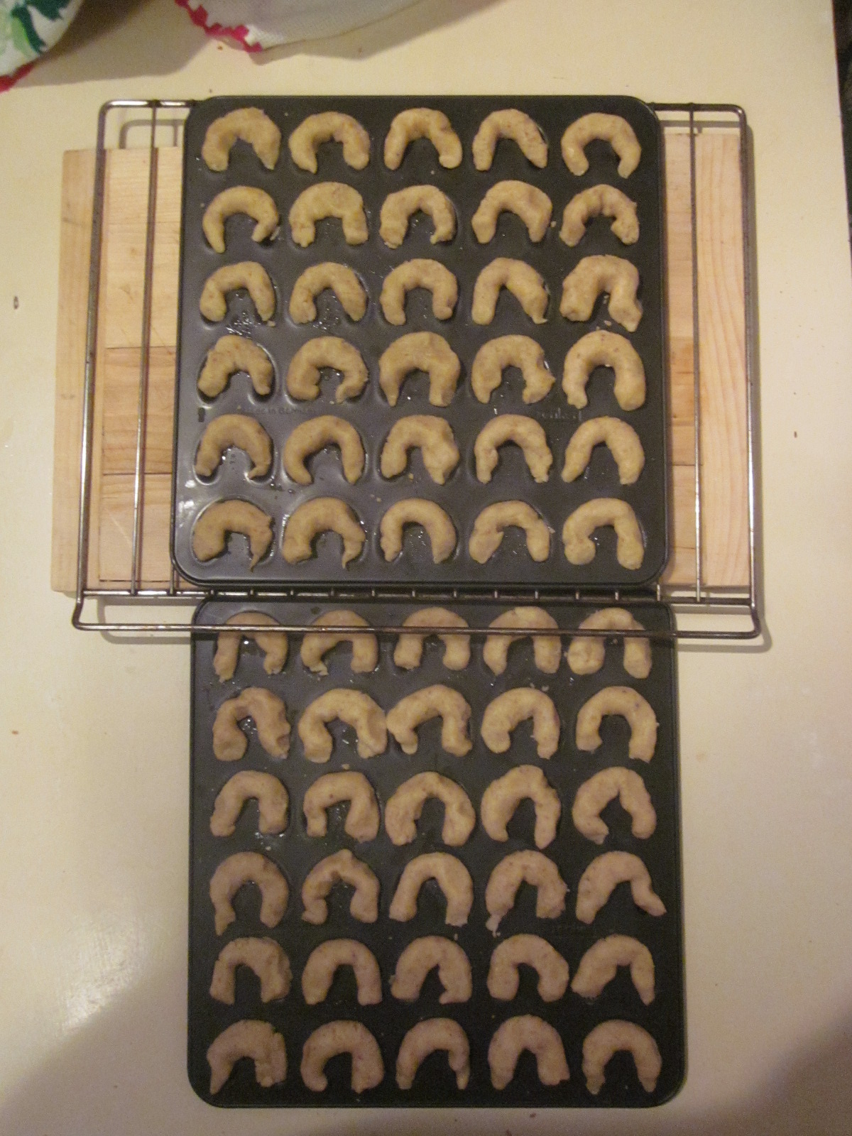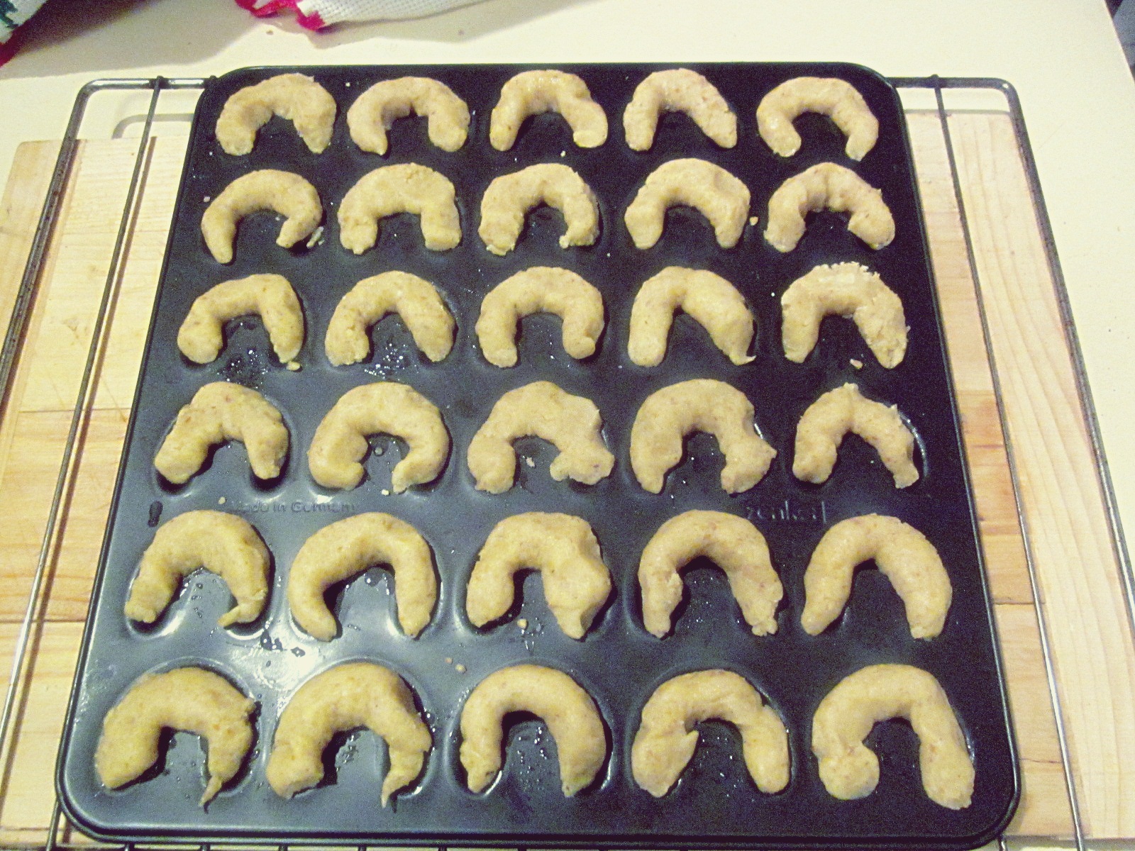 - Aluatul obținut se pune le rece, învelit în folie alimentară, de preferat în frigider, cca. 60 de minute;) După ce s-a ”odihnit” aluatul în frigider, se scoate, apoi se formează semilune;) În sfârșit, am folosit tăvile de cornulețe, achizițonate, în urmă cu muuulltt timp, le-am uns cu puțin unt 😉