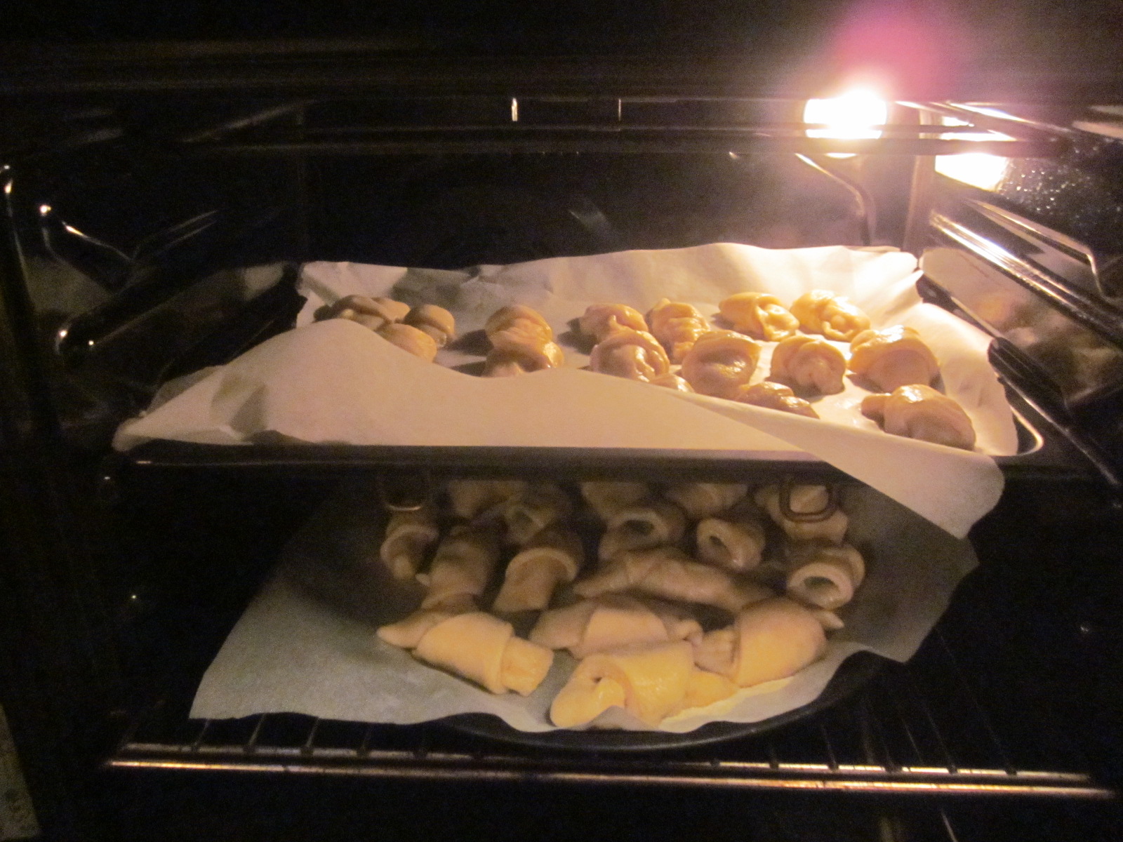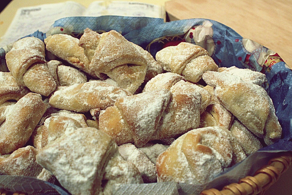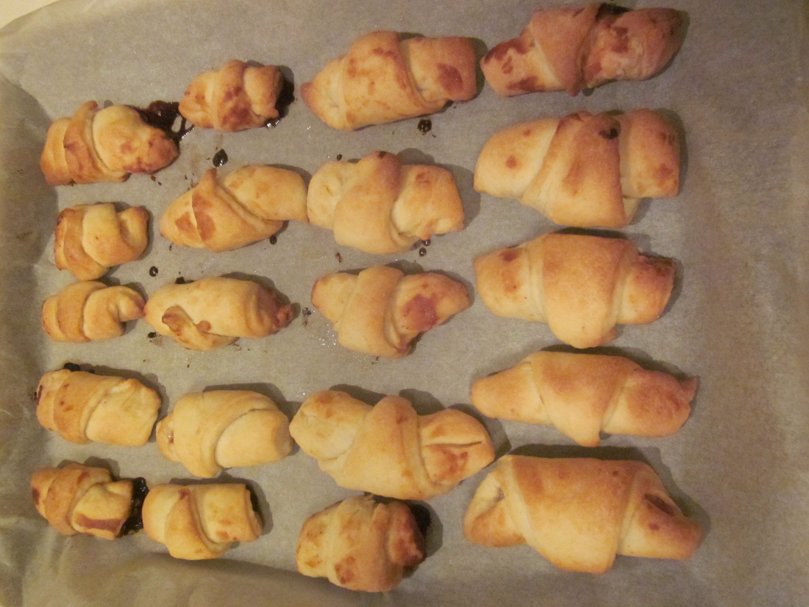 - După ce se obține un aluat ideal, modelabil, se porționează în cca.6 bucăți. Acestea se întind, pe un blat înfăinat, se porționează. La baza triunghirilor se adaugă, dulceață, rahat sau nucă 😉 apoi se rulează și se așează pe o tavă tapetată cu foaie de pergament.