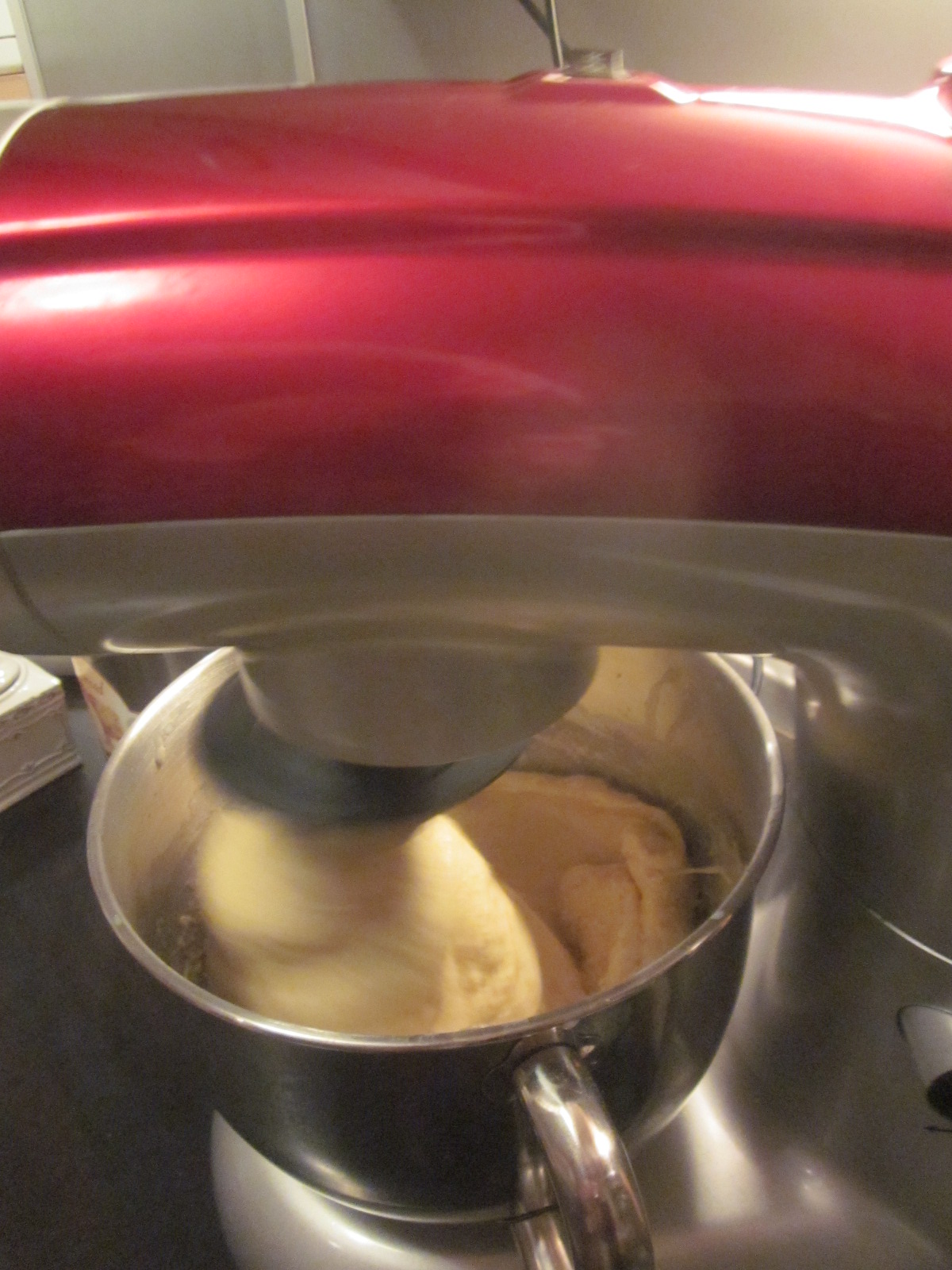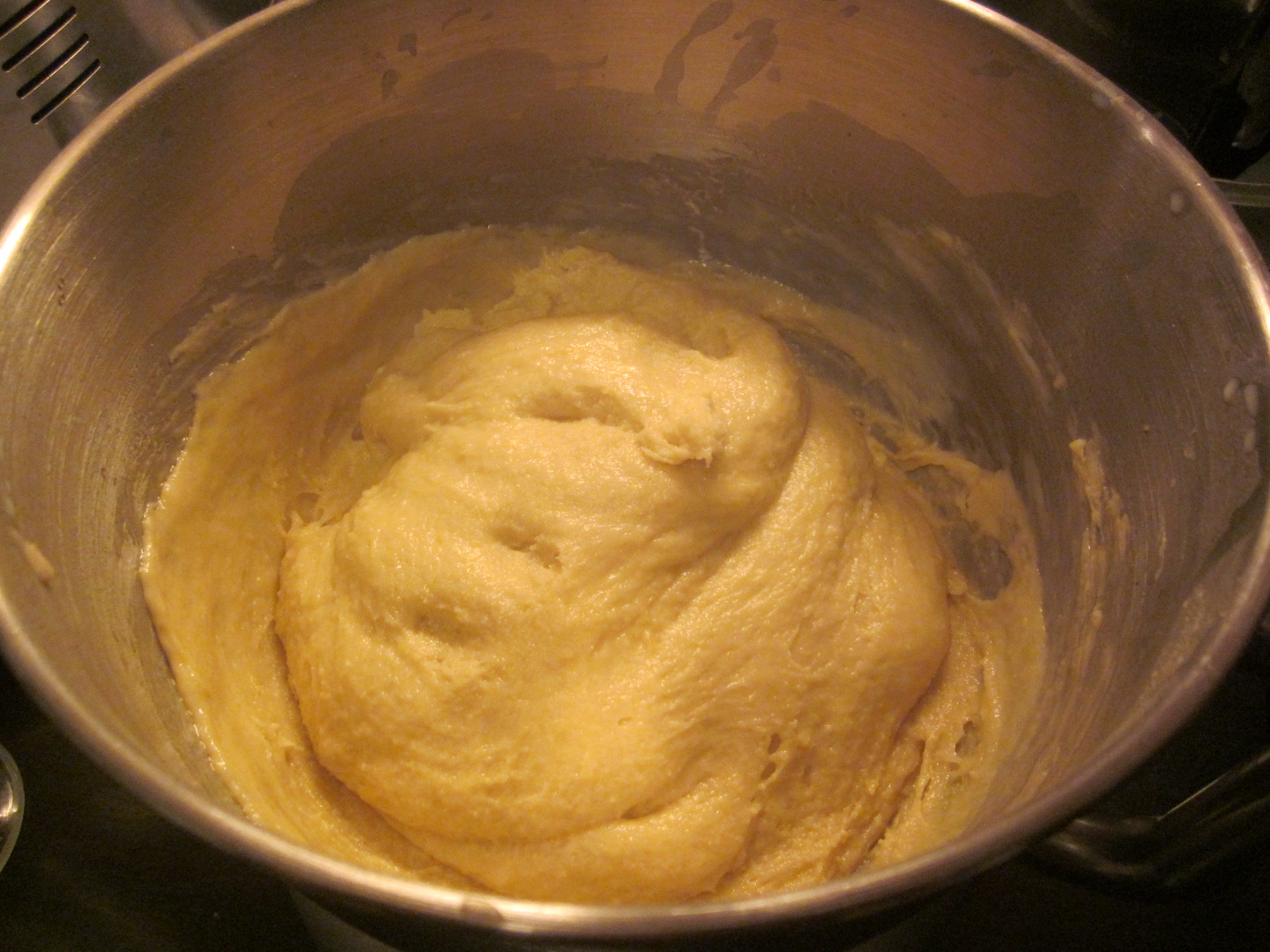 - Într-un vas încăpător se cerne făina de 2 ori, este sfatul lui Bertoni D Albert, ca să iasă mai pufos cozonacul. În laptele călduț se adaugă, drojdia uscată, zahărul, gălbenușurile amestecate bine, praful de sare, coaja de portocală, lămâie se amestecă până se înglobează toate ingredientele. Crema obținută se adaugă peste făină și se începe frământarea. Recunosc că l-am pus la treabă pe Thor, mixer-ul planetar, după ce s-au înglobat toate ingredientele și s-a obținut un aluat ușor lipicios se adaugă uleiul și se mai frământă până se obține un aluat elastic.