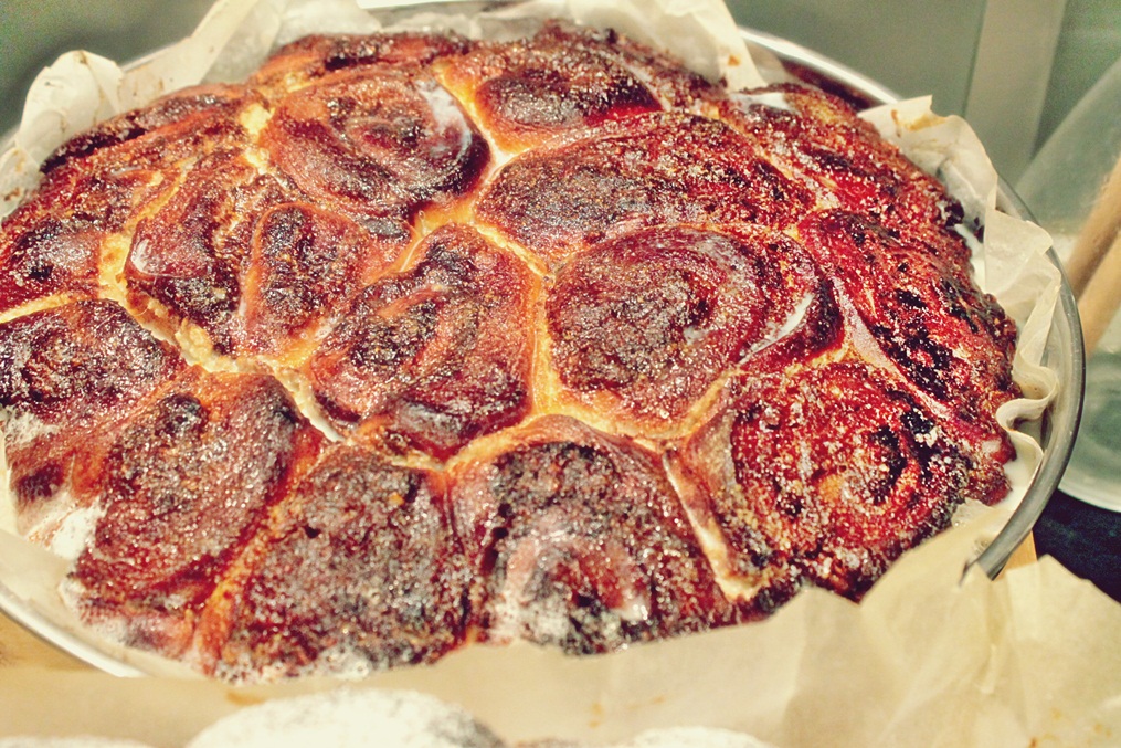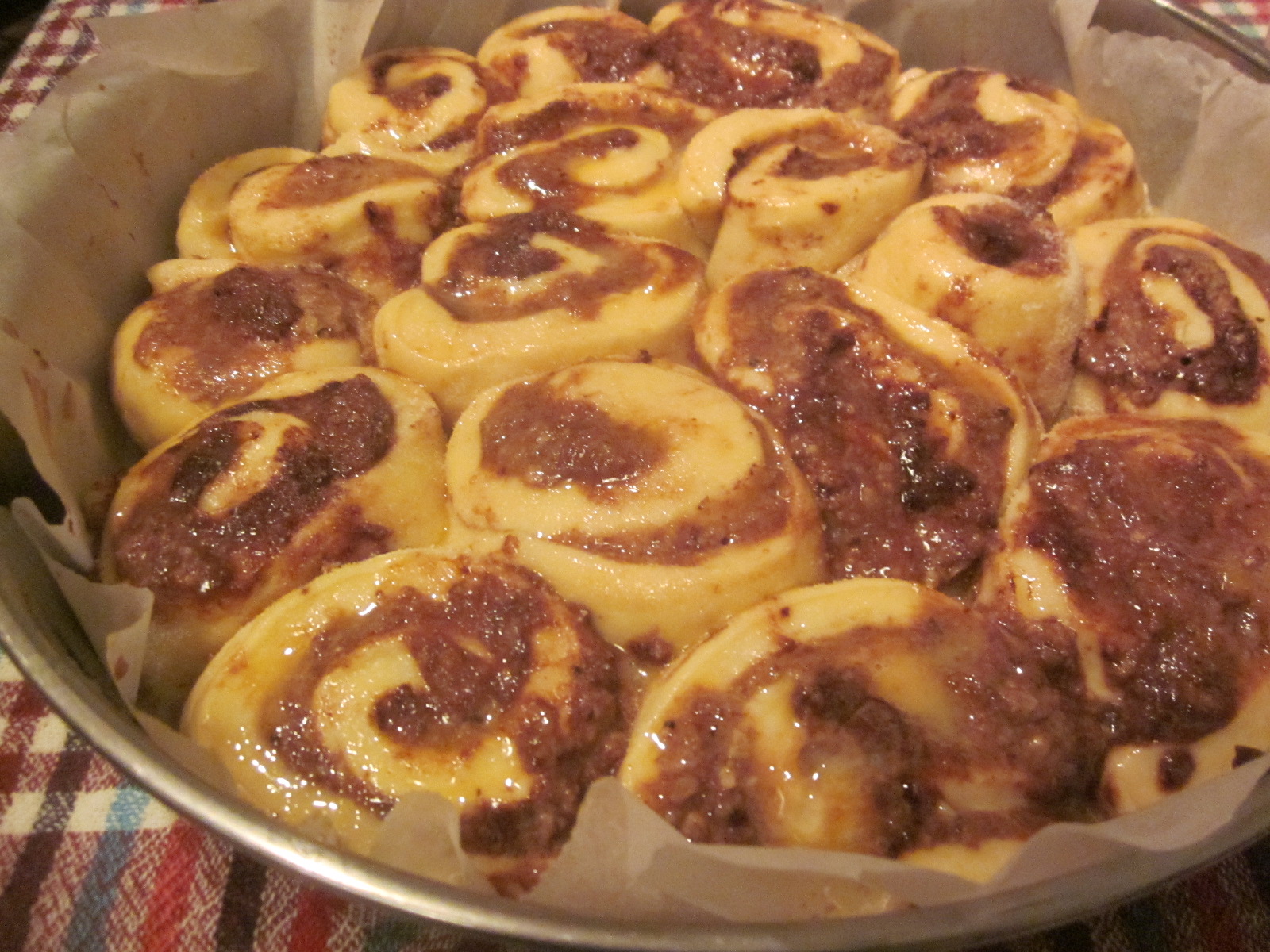 - A doua zi se scoate aluatul de la rece, se răstoarnă pe masa de lucru, se împarte în două bile, care apoi se întind, se unge fiecare foaie cu caramel, http://panacris.blogspot.ro/2016/01/caramel-preparat-in-casa.html, se presară cacao, nucă măcinată, apoi se rulează.