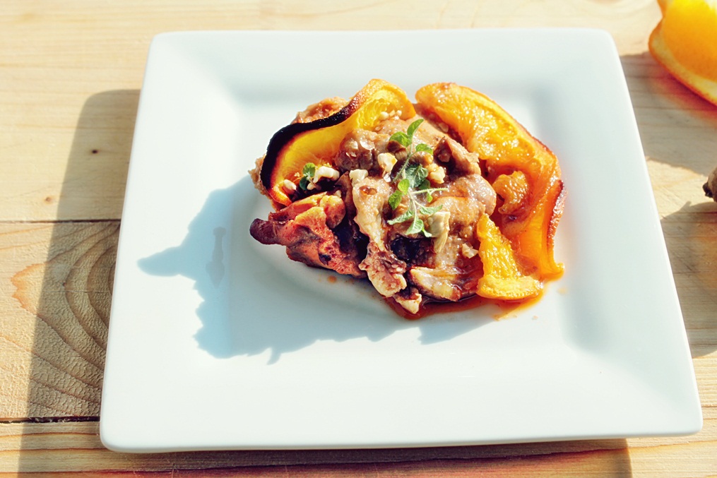 - Portocalele se spală bine cu apă caldă și oțet, apoi se feliază și se așează între bucățelele de carne. Se presară nucile mărunțite apoi se introduce vasul la gătit, în cuptorul preîncins, neacoperit, la 200 grade cca. 15 minute, până începe să se rumenească deasupra.