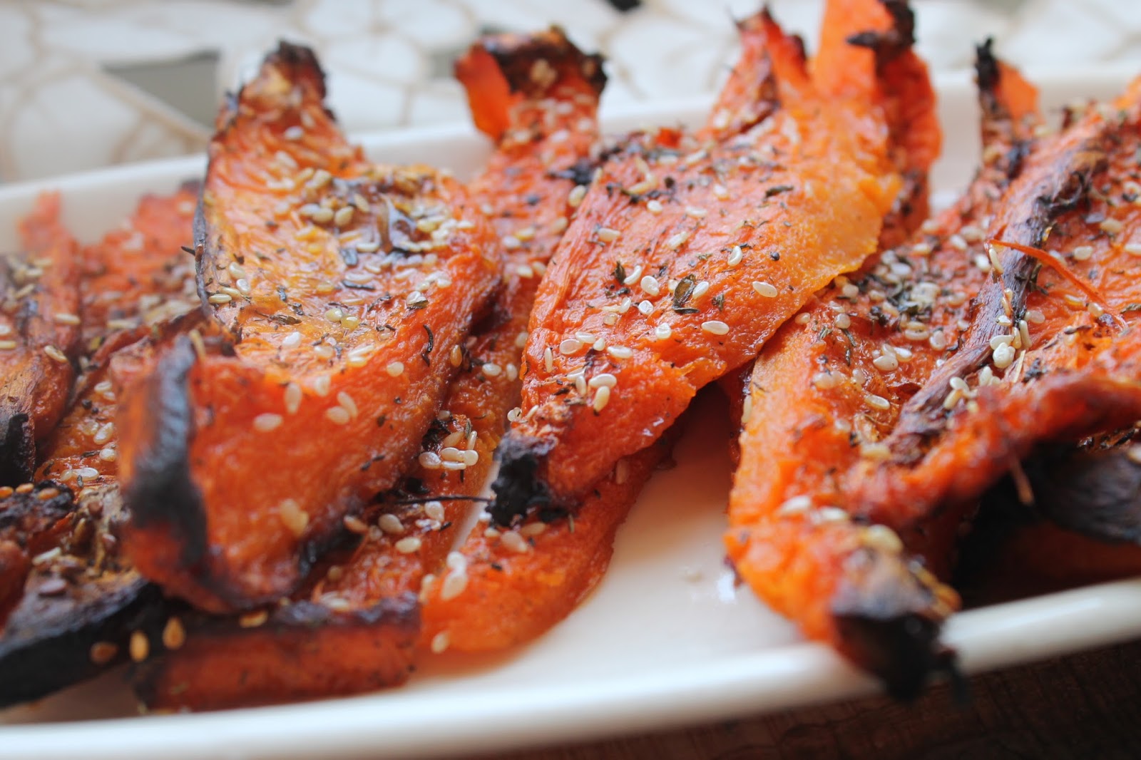 - După ce s-a copt, se curăță de coajă, apoi se feliază, se asezonează de sare, piper, cimbru, semințe de susan și ulei de măsline, apoi se pune din nou la copt ptr cca. 20 de minute la 250 g;)
