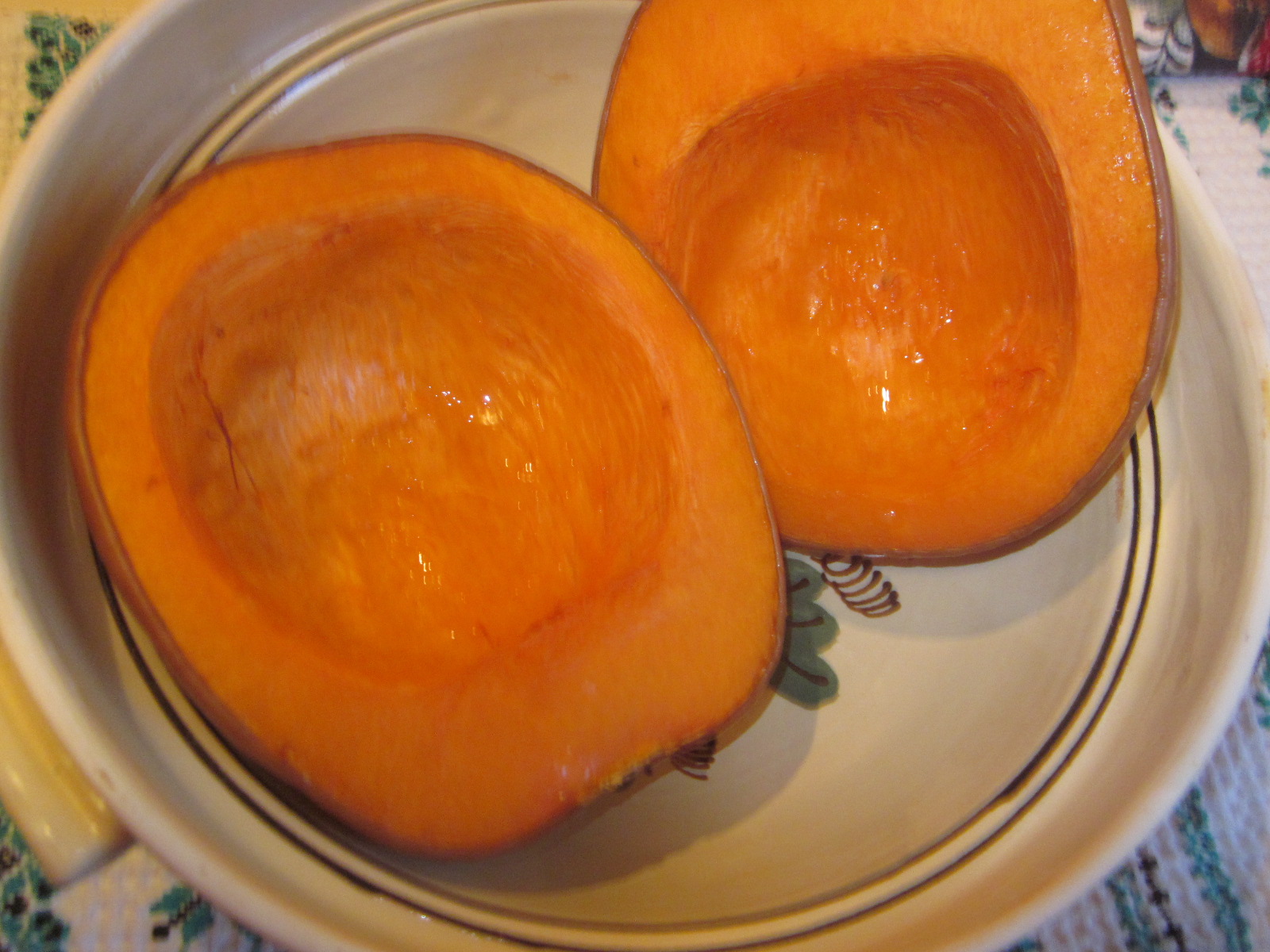 - Dovleacul se taie în două, se curăță de semințe și nervuri, apoi se pune la copt în cuptorul preîncins cca. 60 de minute la 200 grade.