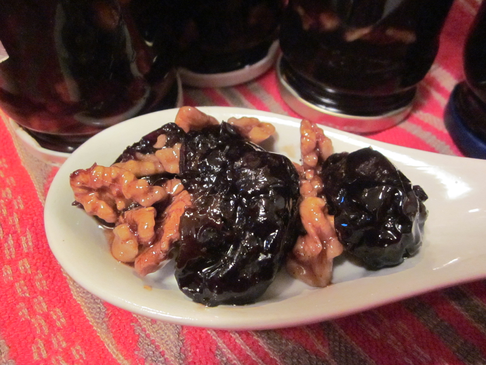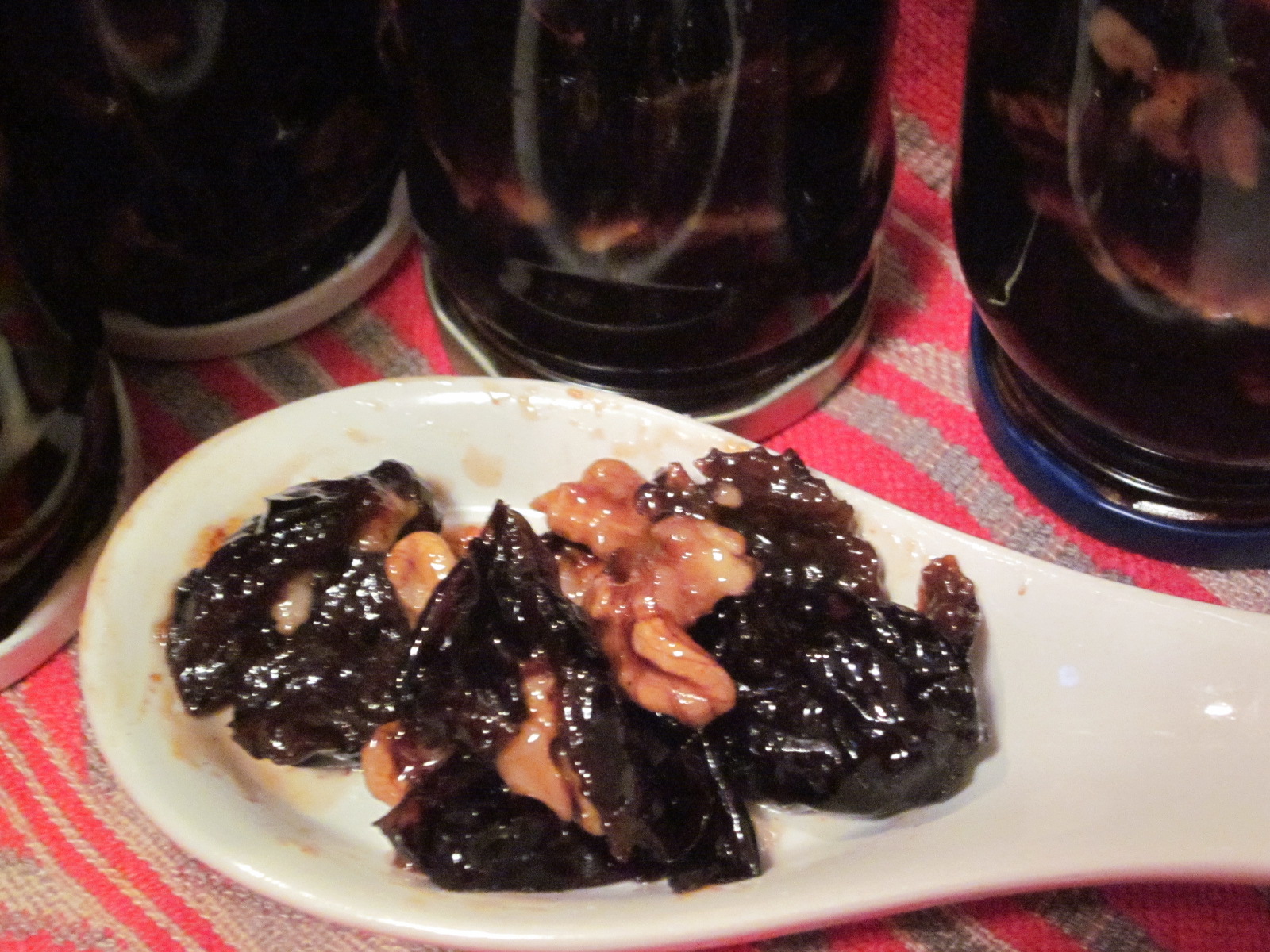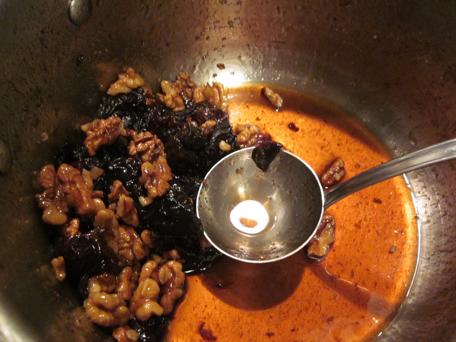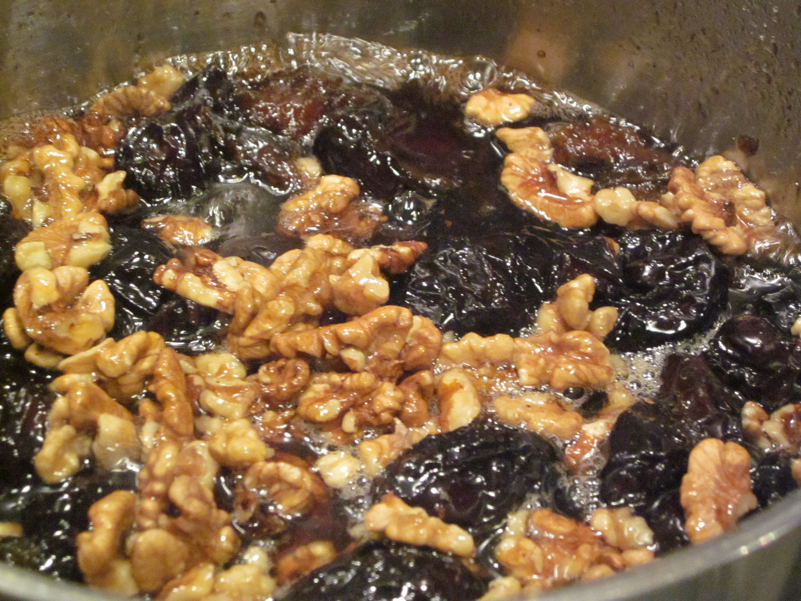 - Spre finalul fierberii , se fierbe la foc mic, adaugandu-se prunele fără sâmburi, lăsându-se la fiert cca. 30 de minute. Spre finalul fierberii se adaugă și nucile, lăsându-se cca. 5 minute la fiert.