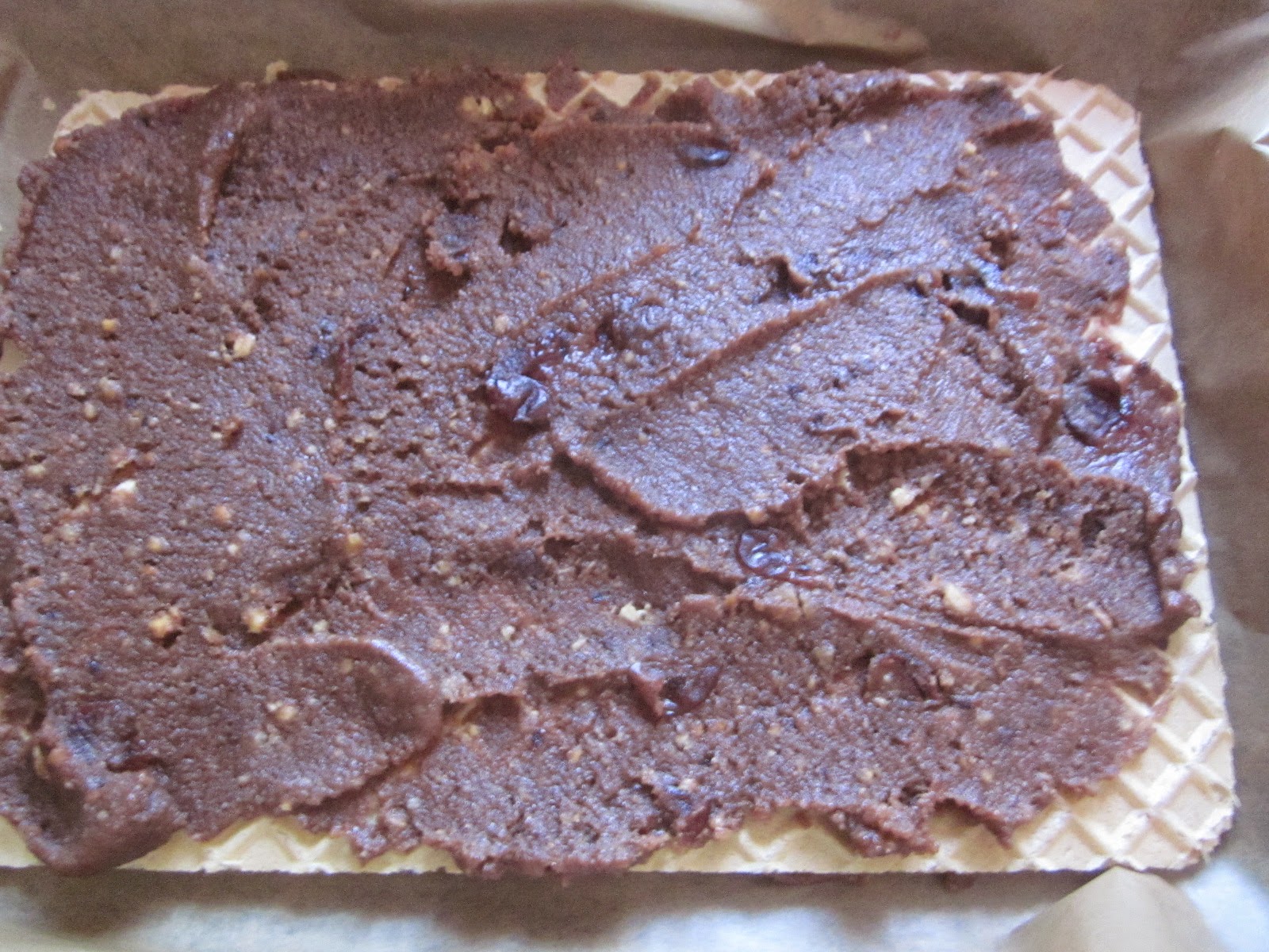 - Se adaugă unutul frecat spumă, esența de rom, pudra de cacao și dulceața, amestecându-se ușor până se înglobează toate ingredientele. Foile de napolitane se ung cu această cremă, așezându-se unele peste celelalte.