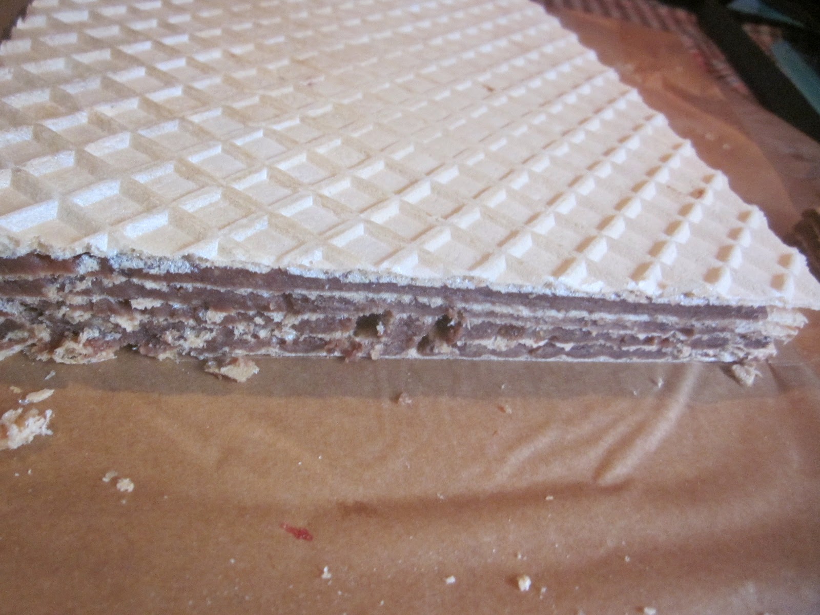 • Se adaugă unutul frecat spumă, esența de rom, pudra de cacao și dulceața, amestecându-se ușor până se înglobează toate ingredientele. Foile de napolitane se ung cu această cremă, așezându-se unele peste celelalte.