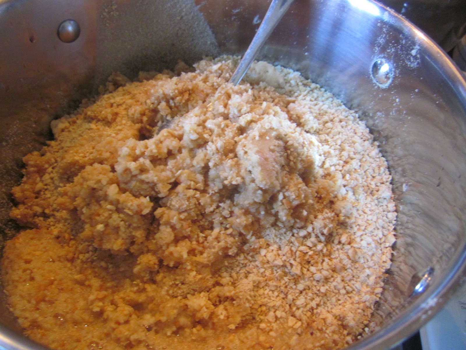 - Se adaugă biscuții mărunțiți cu ajutorul robotului, lăsându-se la fiert cca. 3 minute, amestecându-se continuu până ce se înglobează.