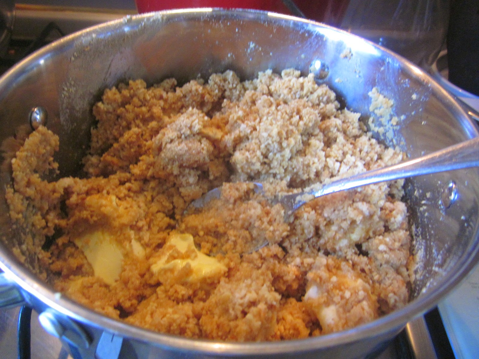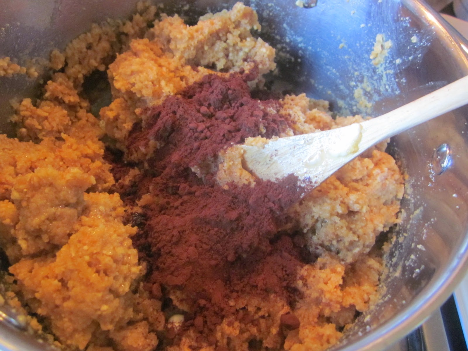 • Se adaugă biscuții mărunțiți cu ajutorul robotului, lăsându-se la fiert cca. 3 minute, amestecându-se continuu până ce se înglobează.