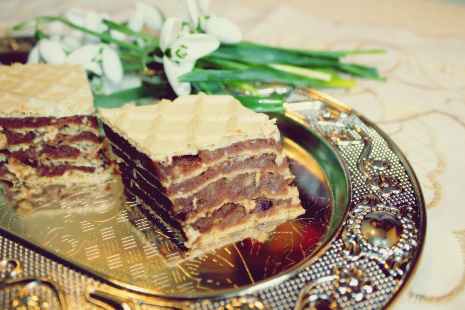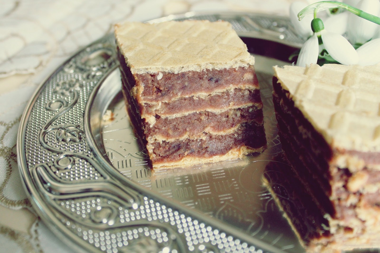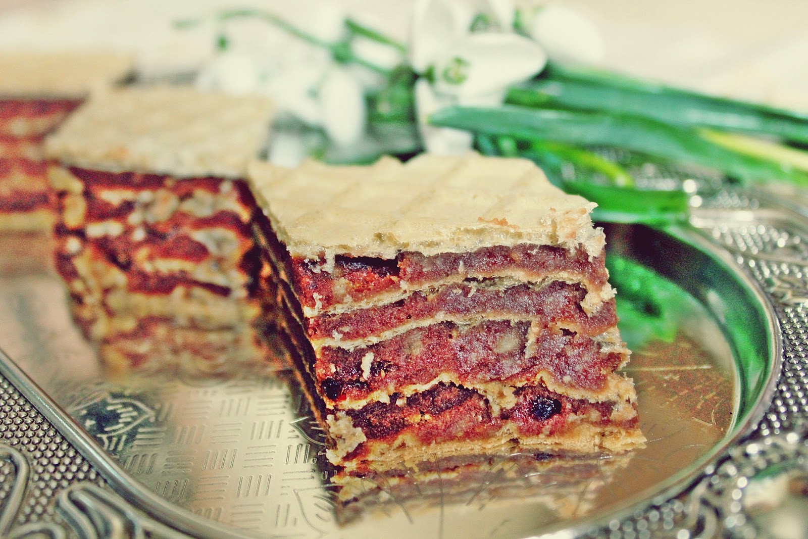 • Deasupra prăjiturii se așează o greutate și se dă la rece până a doua zi, când se taie în pătrățele sau romburi. Spor, răbdare și poftă bună! 😉