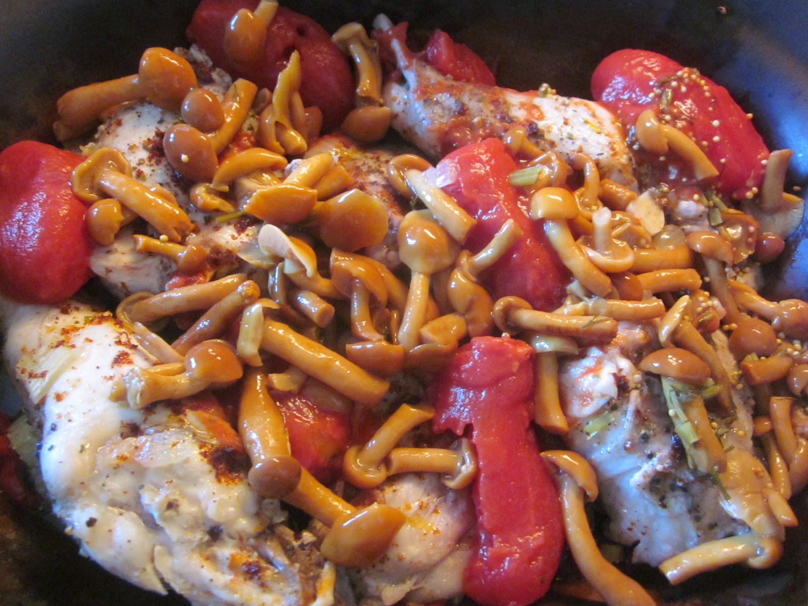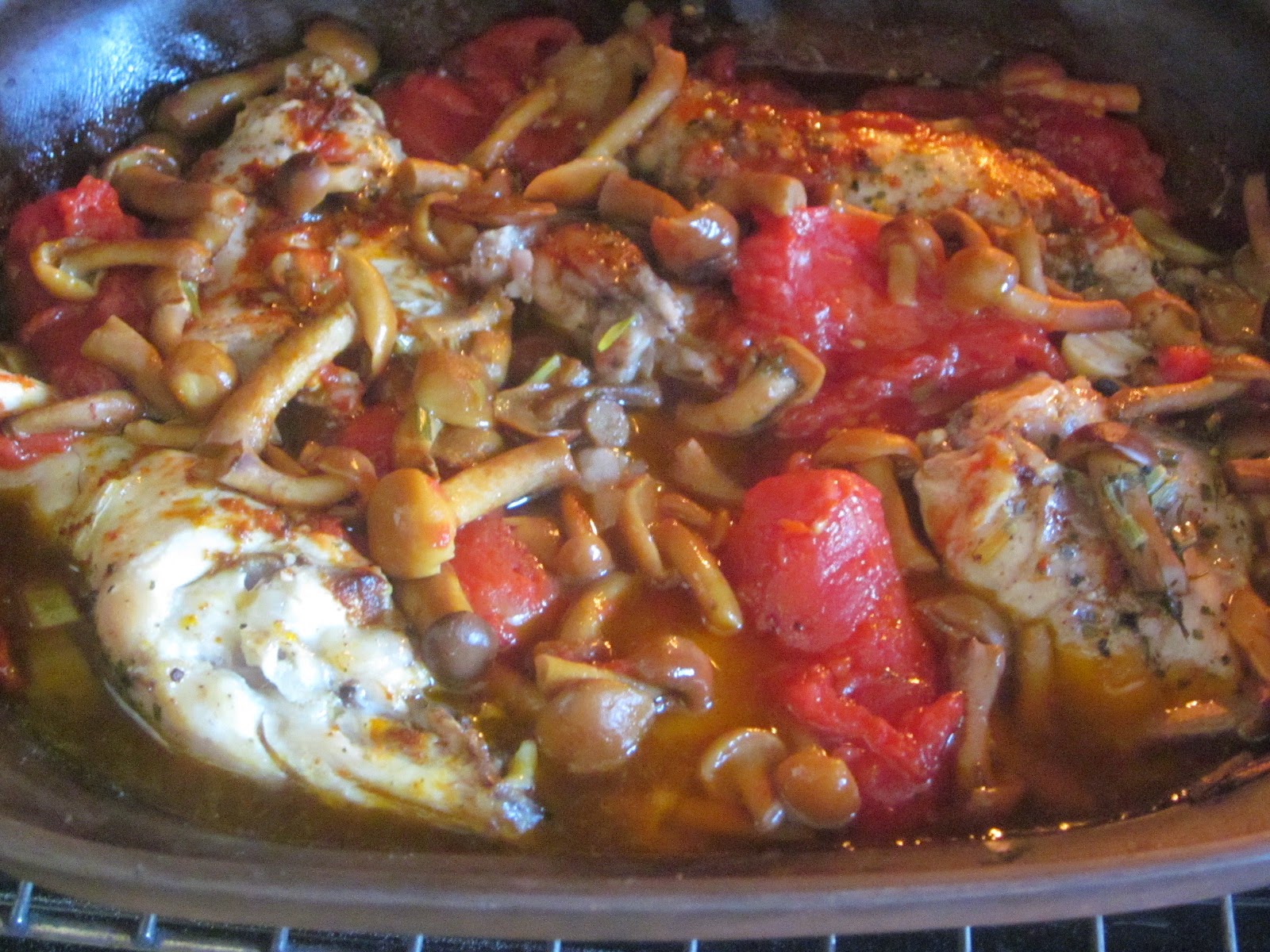 - Se asezonează cu un pic de ulei dacă mai este necesar, se acoperă și se dă la copt în cuptorul rece, cca. 60 de minute la 200 grade. După cele 60 de minute, se scoate vasul din cuptor, se adaugă roșiile decojite și ciupercile, se întorc bucățile de iepure ca să se rumenească și pe cealalță parte, apoi se dă din nou la copt ptr cca. 20 de minute, tot acoperit.
