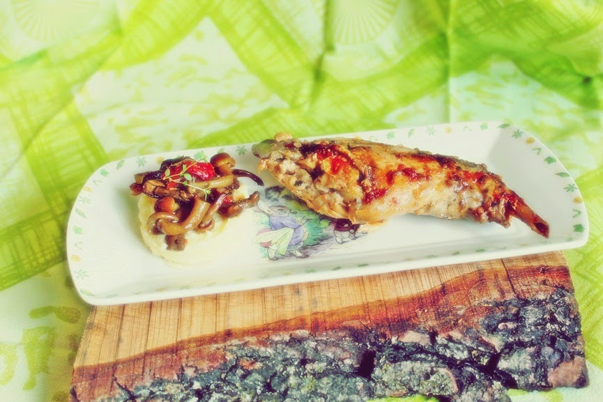 - Se asezonează cu un pic de ulei dacă mai este necesar, se acoperă și se dă la copt în cuptorul rece, cca. 60 de minute la 200 grade. După cele 60 de minute, se scoate vasul din cuptor, se adaugă roșiile decojite și ciupercile, se întorc bucățile de iepure ca să se rumenească și pe cealalță parte, apoi se dă din nou la copt ptr cca. 20 de minute, tot acoperit.