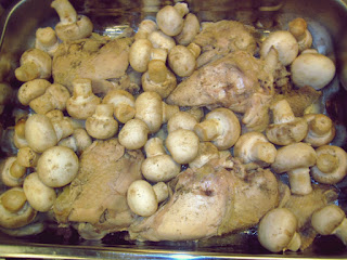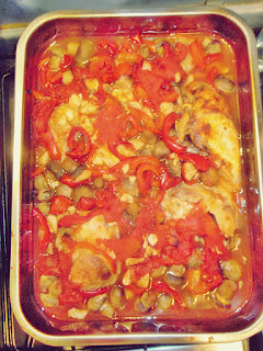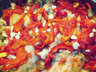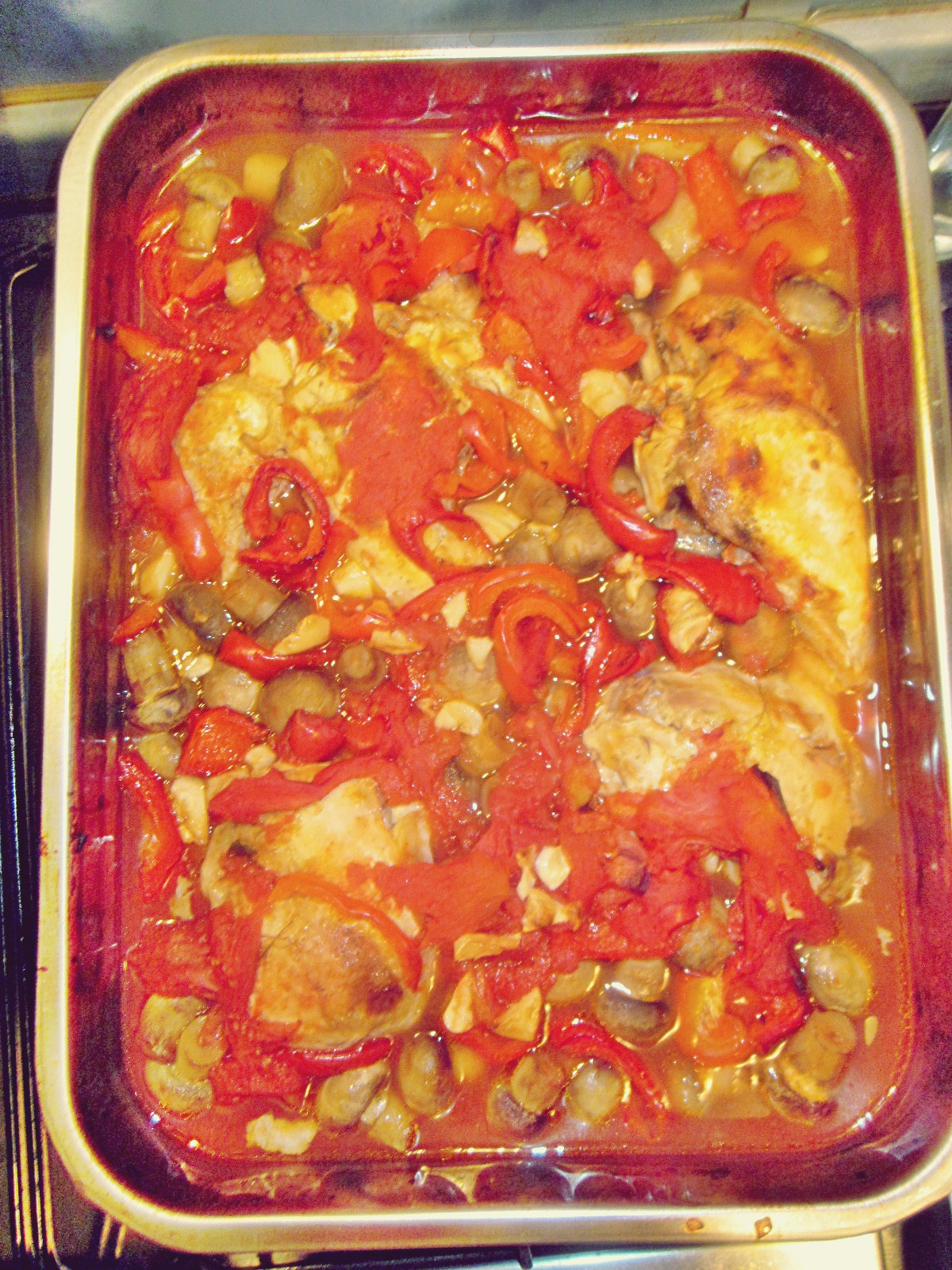 - Ciupercile spălate și curățate, se așează întregi printre bucățile de pui, apoi se acoperă cu roșiile din conservă, (inițial am vrut cuburi, dar am avut numai întregi, ce apoi le-am mărunțit!), ardeii kapia feliați și usturoiul curățat, de asemenea feliat completându-se cu apa în care a fiert puiul, atât cât să acopere friptura.