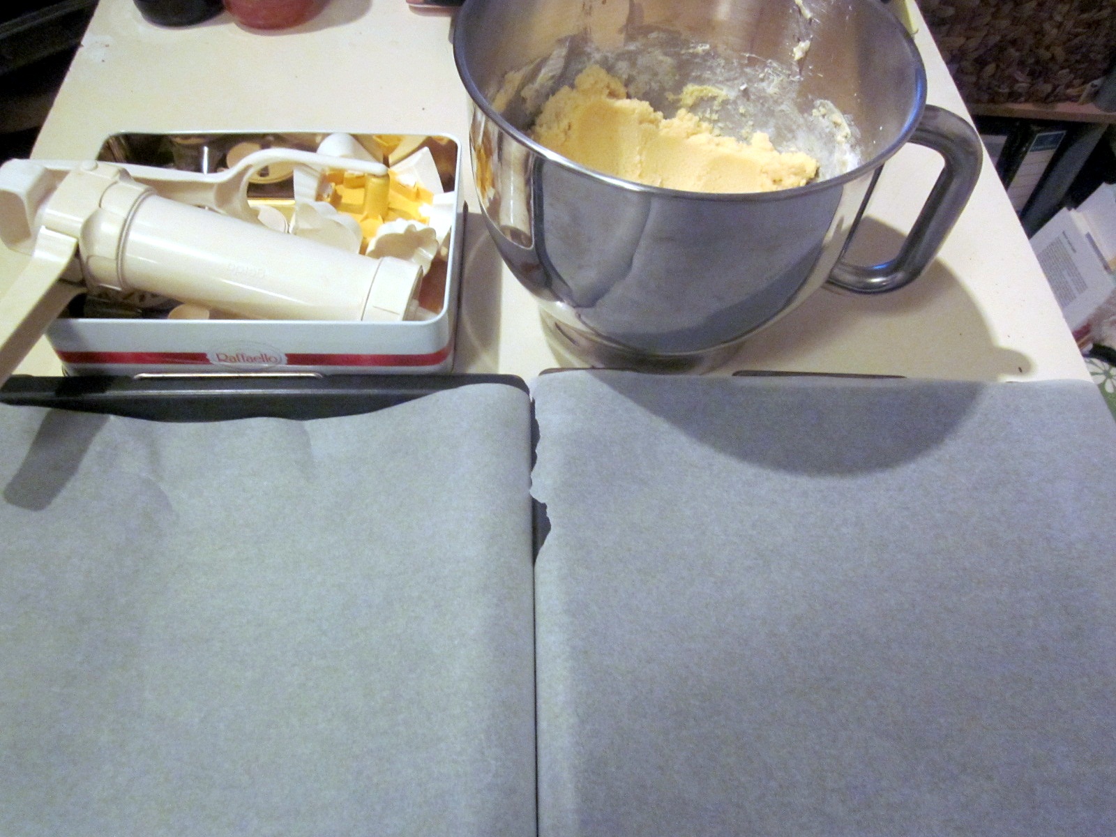 - Cu ajutorul aparatului pentru fursecuri, sau cu al unui poș, se sprițează forme, direct în tava de copt tapetată cu foaie de pergament.