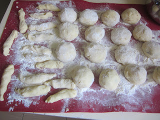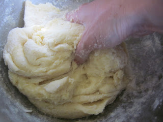 Apoi se adaugă ouăle, făina, amidonul, grișul, untul bucățele și uleiul, frământânădu-se până se obține un aluat omogen și molcuț, dacă e nevoie mai puneți puțină făină sau gris.